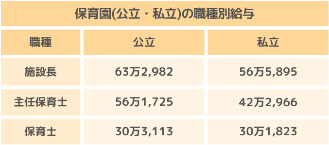 まずは公立(公務員保育士)と私立園の保育士の給与を比較してみましょう。
