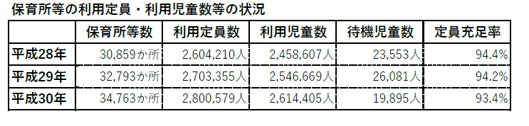 厚生労働省が調査した「保育所等の利用定員・利用児童数等の状況」によると、平成28年の保育所等数は合計で30,859か所に対し、平成30年には34,763か所と約2年間のあいだに3,904か所も増えています。それに伴い、待機児童も平成28年から30年にかけて約3000人も解消することができました。受け皿となる保育園の数を増やしていくことで、子どもの預け先を確保することができ保護者の社会復帰に貢献しているのです。