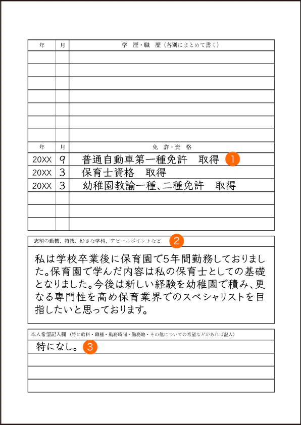 免許・資格資格などの取得年月は必ず記入。民間資格でも応募先の仕事に活かせる内容のものは記入可。未取得でも取得予定のものや勉強中でアピールできる場合は記入したほうが良い。