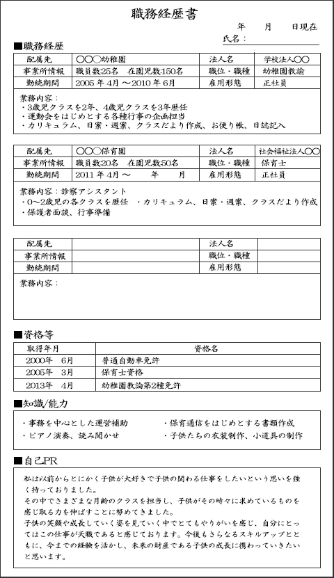 キャリア別に職務経歴書を書くという手法もありますが、保育園や幼稚園では年齢や職歴を重ねるごとにどのようにあなたが成長していったかという過程を知りたいという声が多いようです。