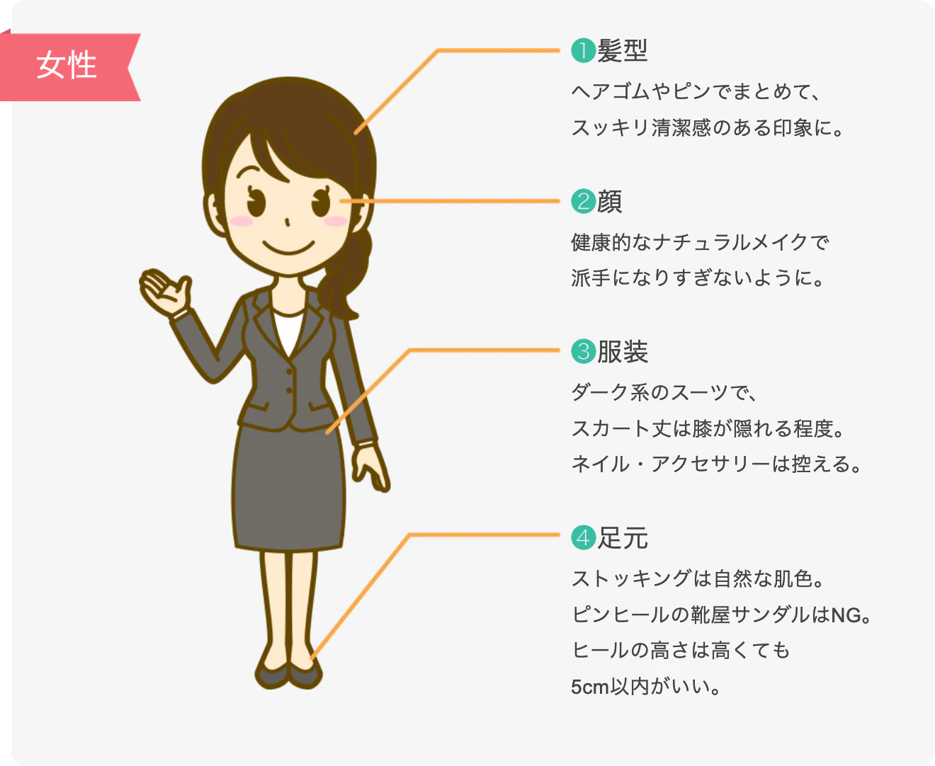 ダーク系のスーツで、スカート丈は膝が隠れる程度。ネイル・アクセサリーは控える。