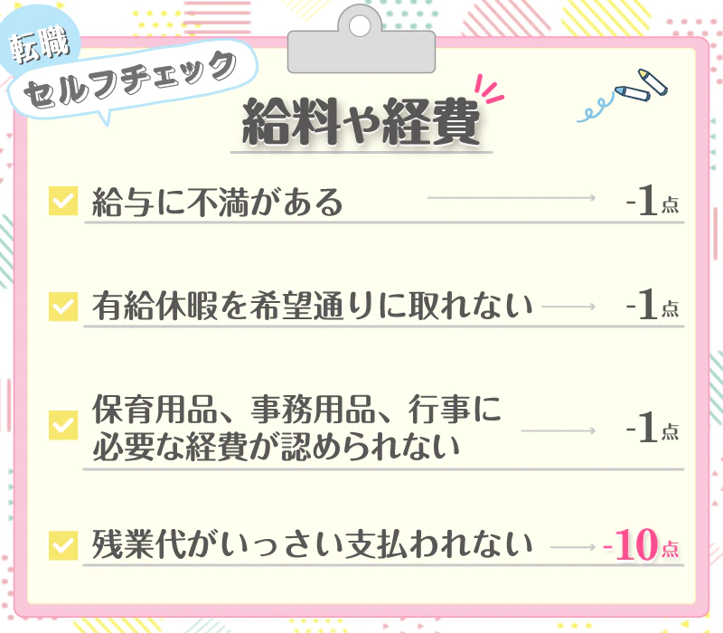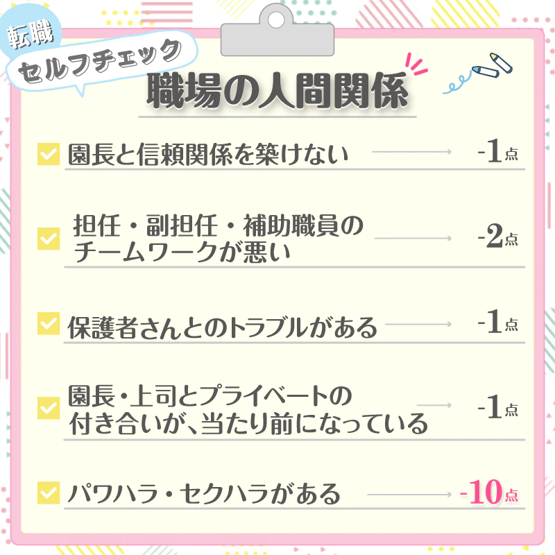 園長や同僚、保護者など、人間関係をチェックしてみましょう。
