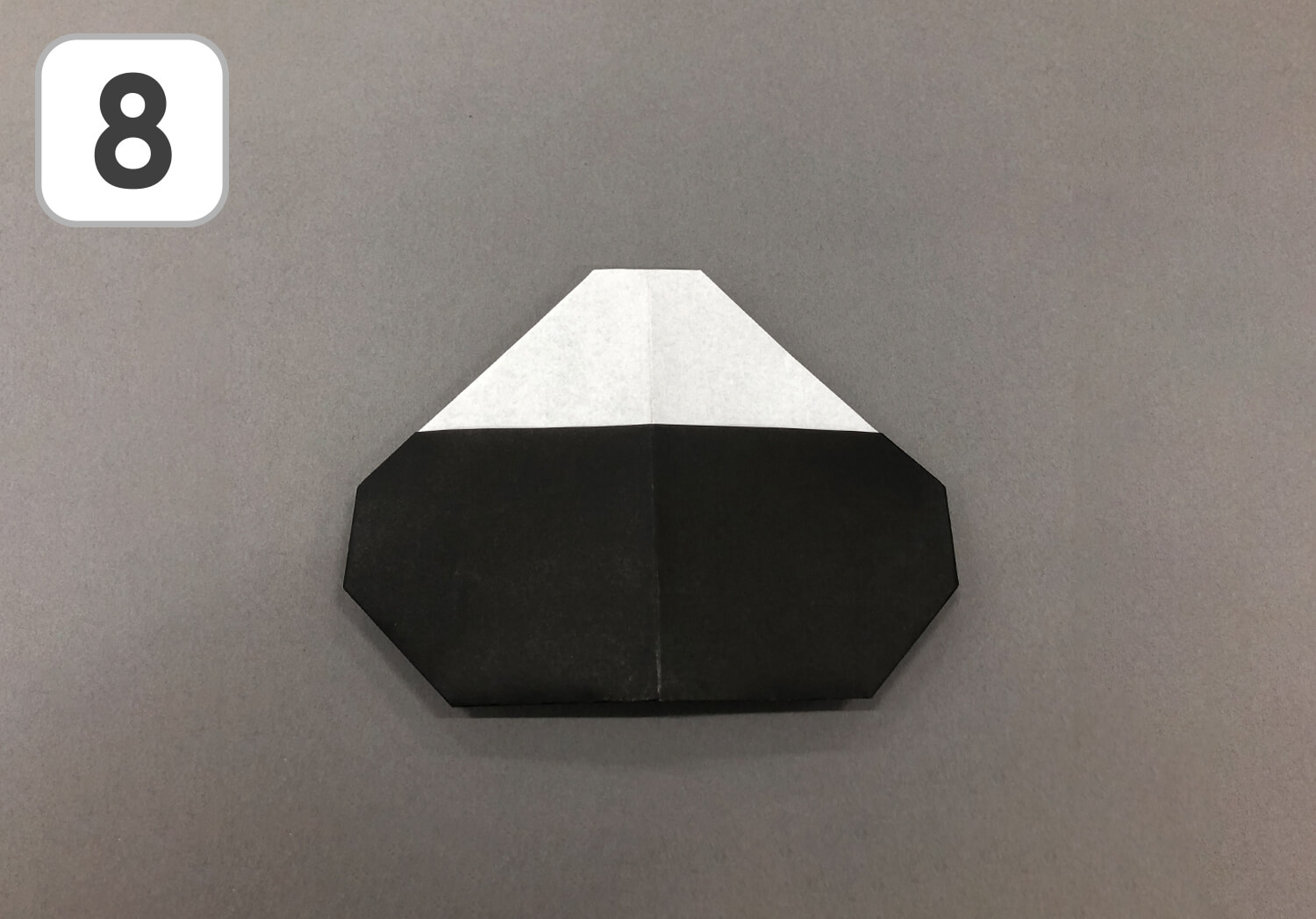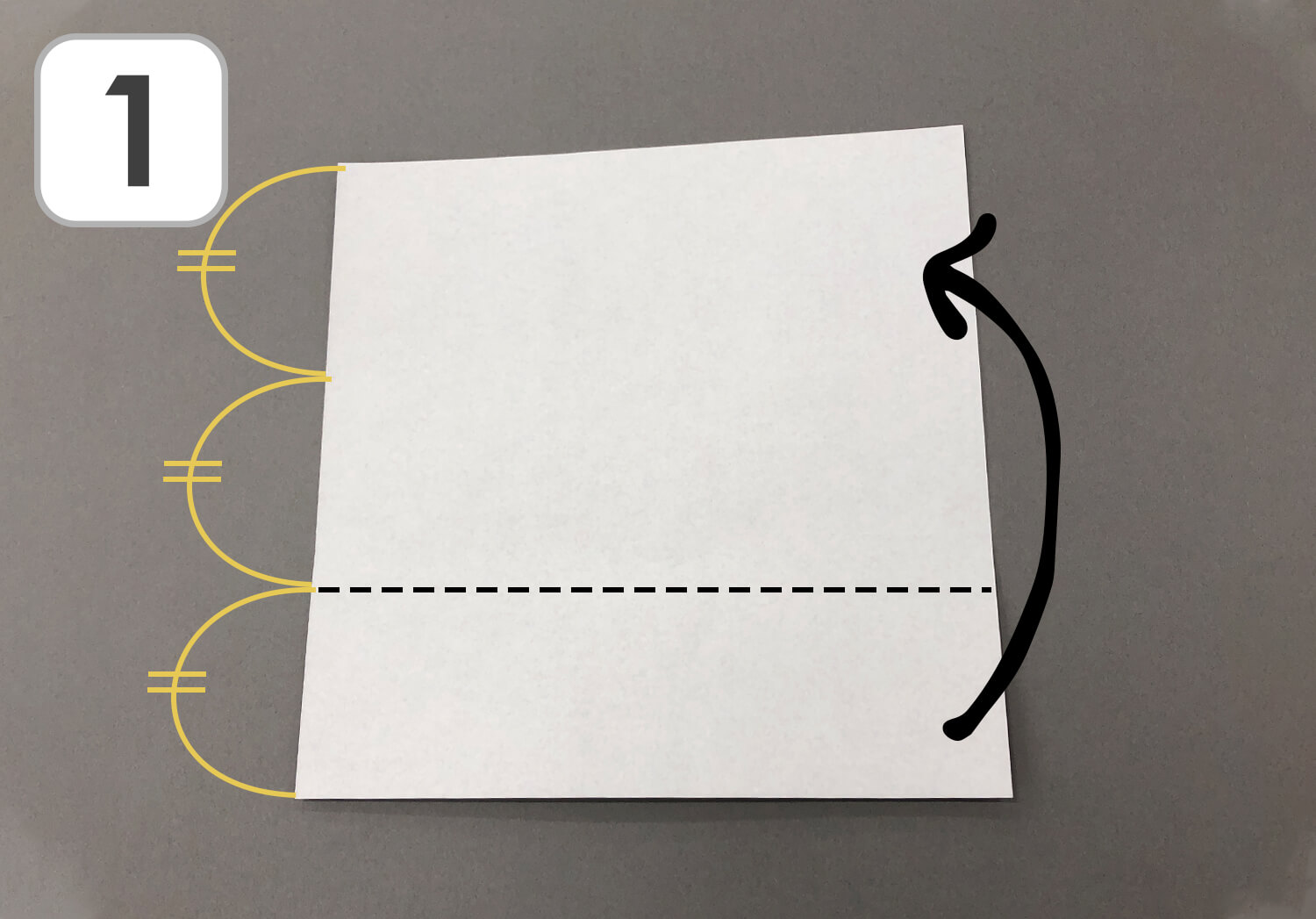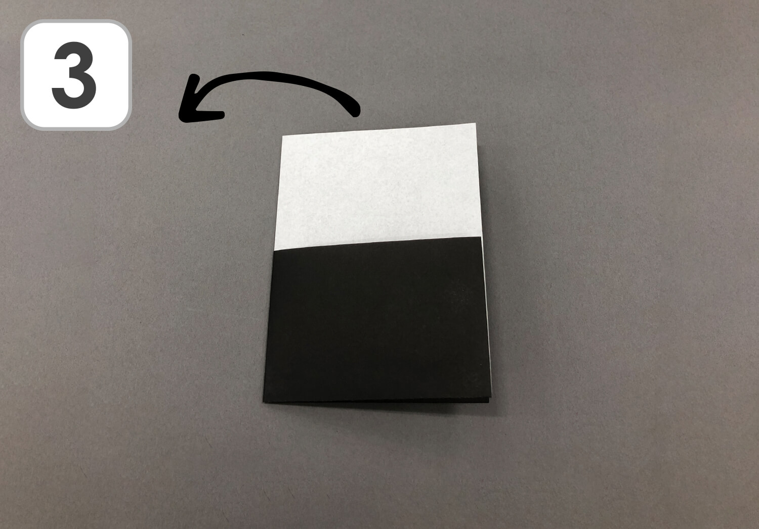 ① 黒のおりがみを使います。おりがみの白の面を上に向けて置き、下から1/3のところで折ります。