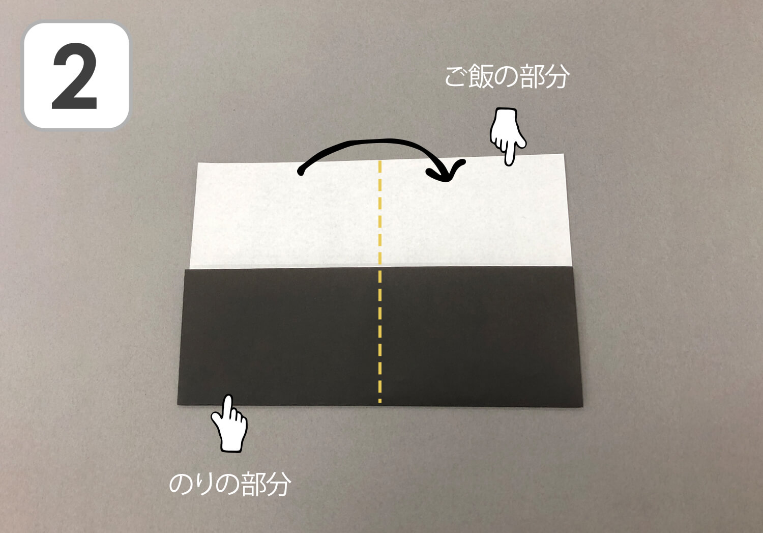 ※白い部分がご飯の部分、黒い部分がのりの部分になるので、見本は三等分の幅になっていますが、一人ひとりの思いに沿った幅になっていても個性が出ていいですね◎