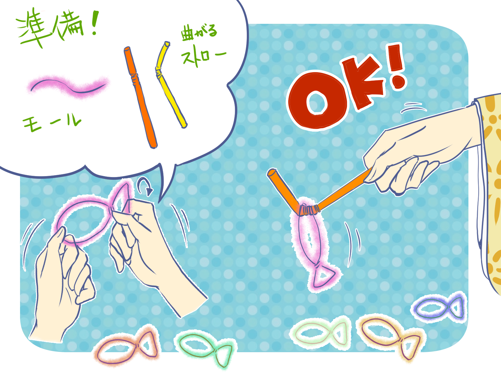 魚の形になるようにモールをねじります。床(机)に置いたときに魚の体が反るようにカーブをつけてあげるとすくい易いです。ストローの曲がるほうの先も少し短く切って、モールに引っ掛けてすくいます。床でも卓上でもできるので保育園のスペースにあわせて準備してくださいね♪