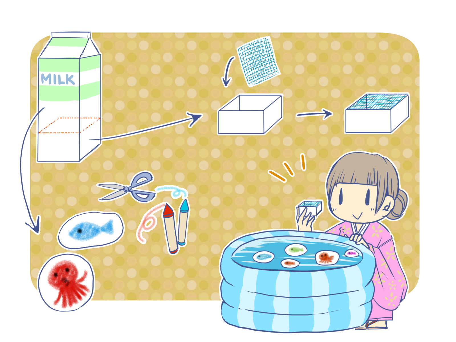 残った牛乳パックにクレヨンで金魚の絵を描き切り抜いたものを水に浮かべ金魚すくいをします。