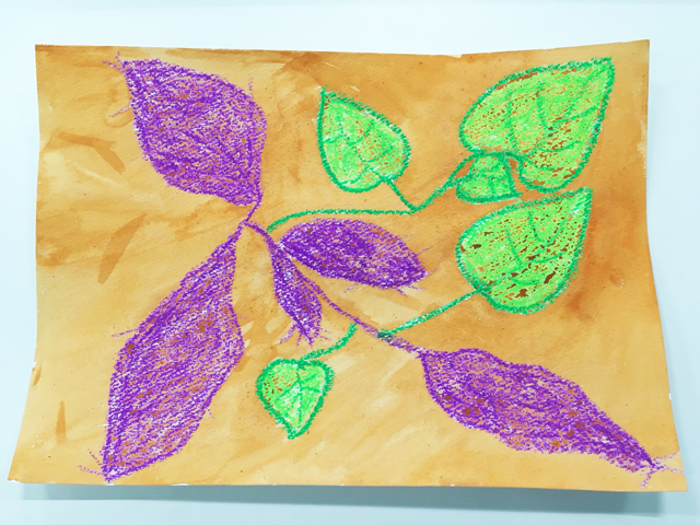 はじき絵は、クレヨンで描いた絵の上に、水で薄めた絵具を塗る技法のこと。