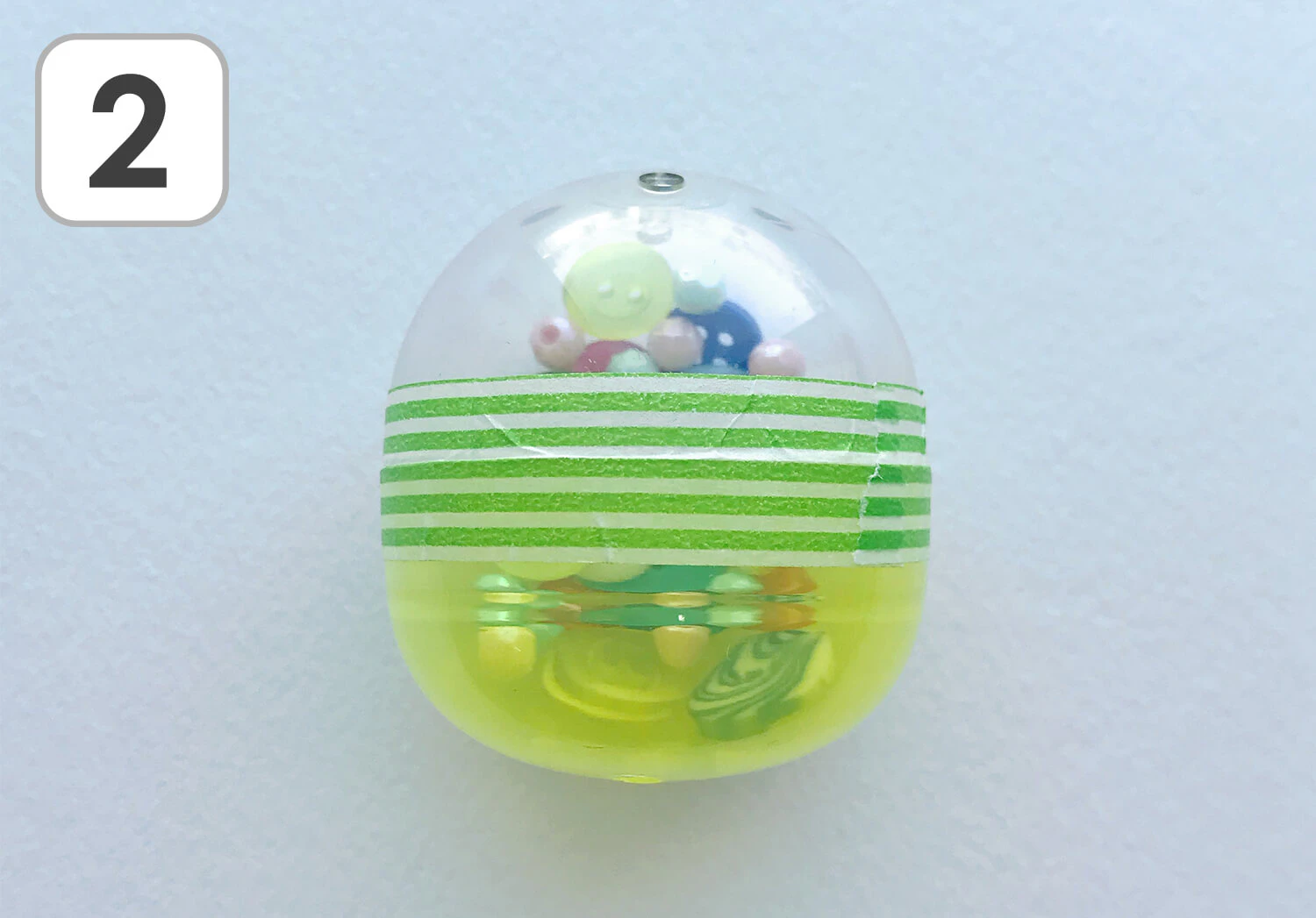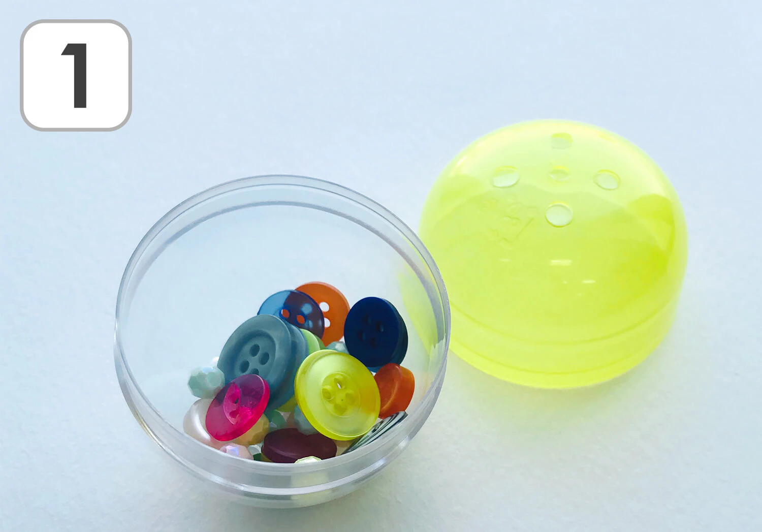 ① ガチャガチャのカプセルの中にボタンやビーズを入れます。
