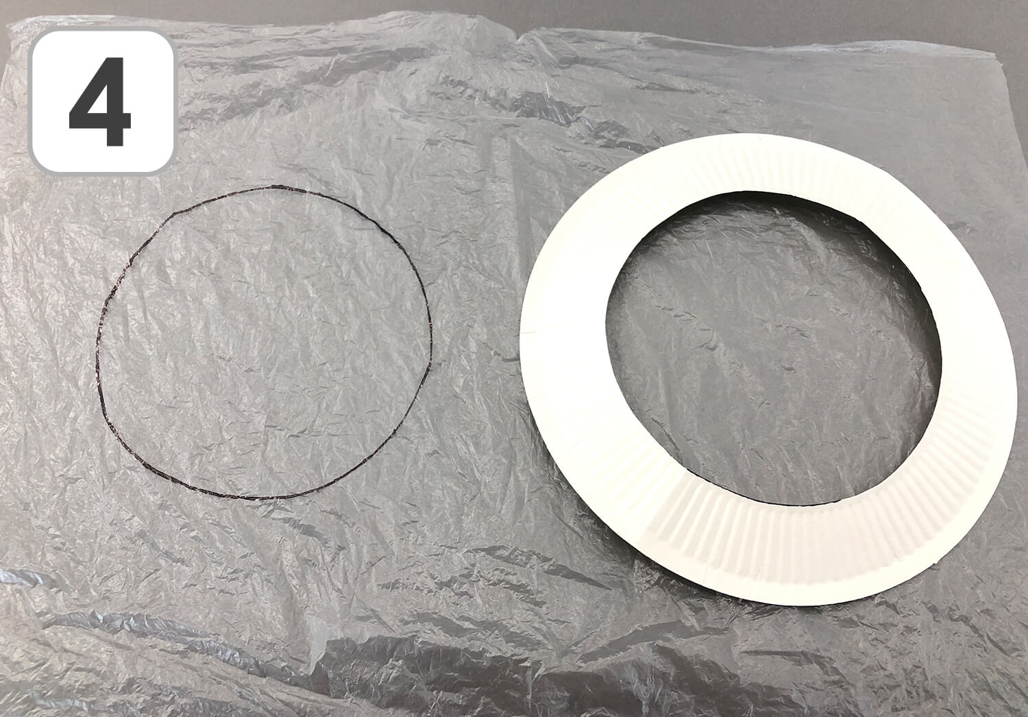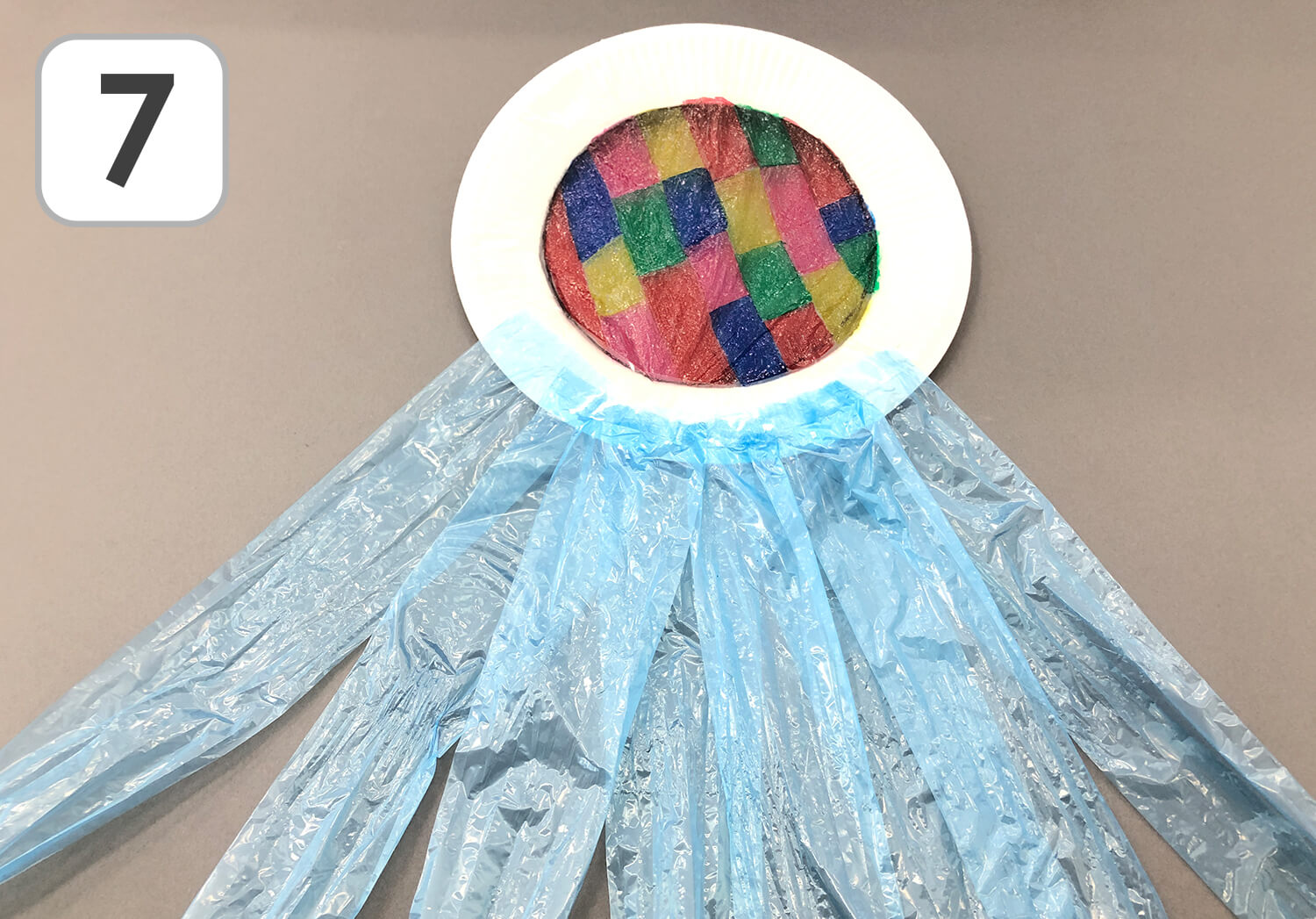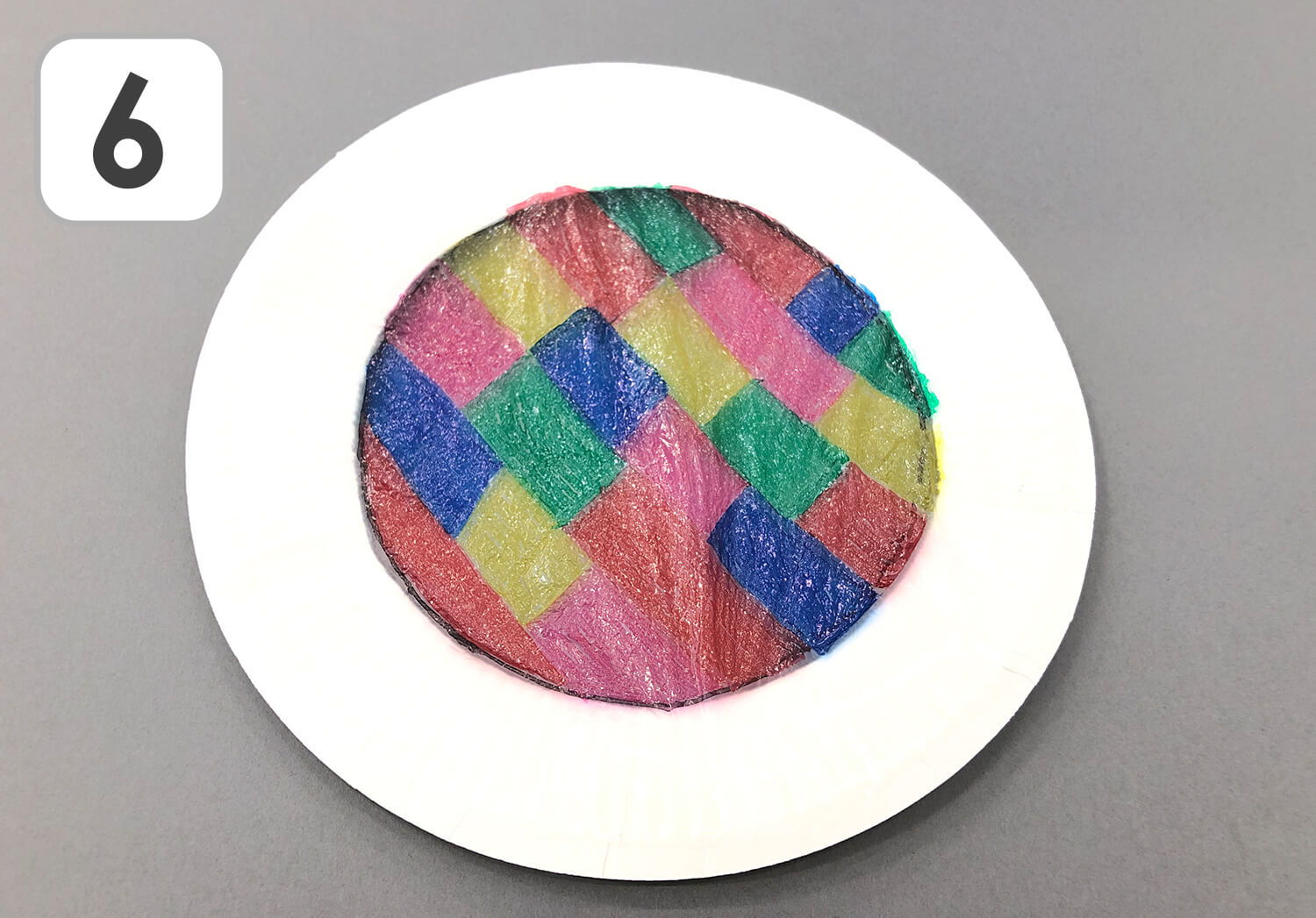 ⑥ 切り取ったビニールを紙皿の後ろにセロテープで貼り、カラーマジックペンで好きなように色を塗っていきましょう!