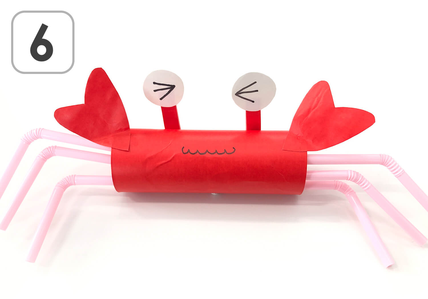 ⑥ 作ったパーツをテープやのりでくっつけたら、かわいい"かに"の完成です!