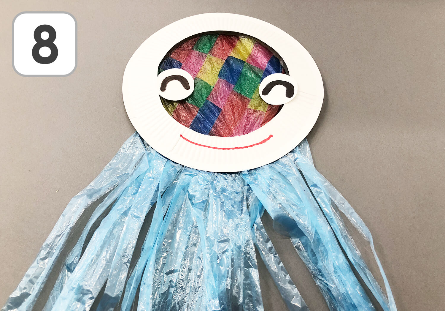 ⑧ 最後に、目や口を描いたり・画用紙を切って貼ったりすることでより一層かわいらしいクラゲになりますね。