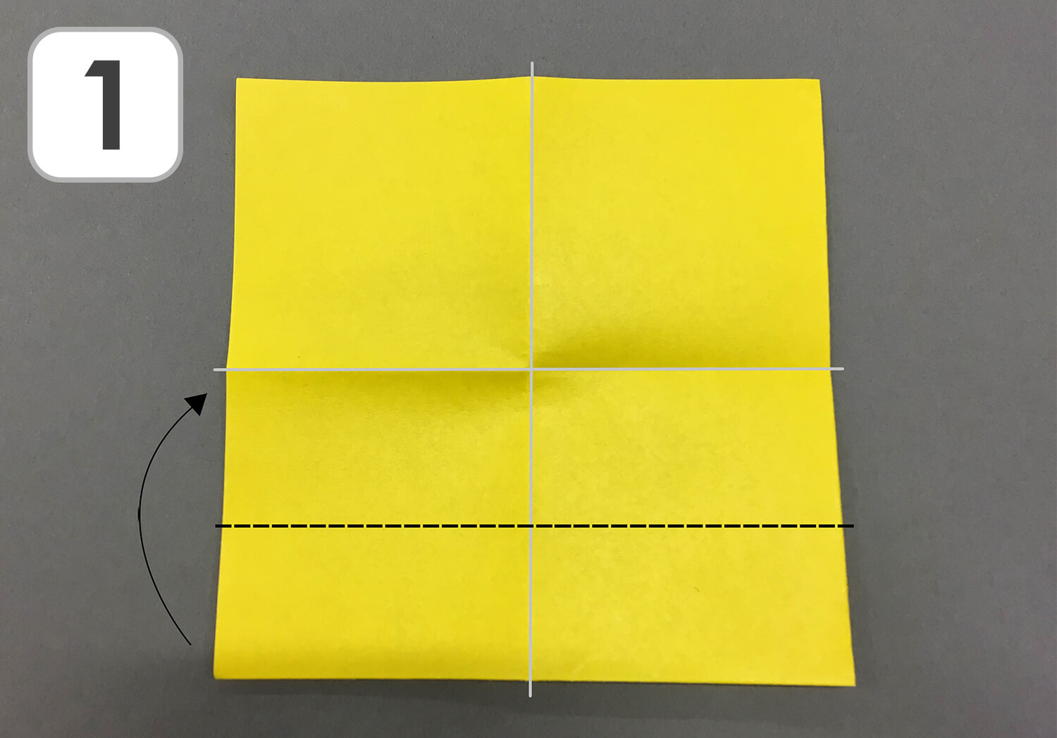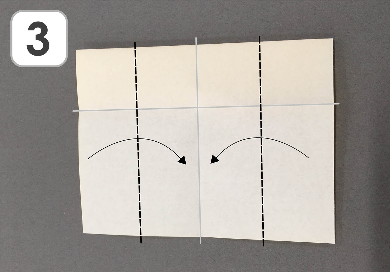 おりがみを横に2回折って、折り線をつけたら開きます。
