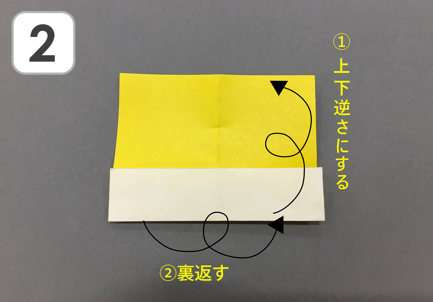 次に、色のついている面を表にして、真ん中の横の線に合わせて谷折りにします。