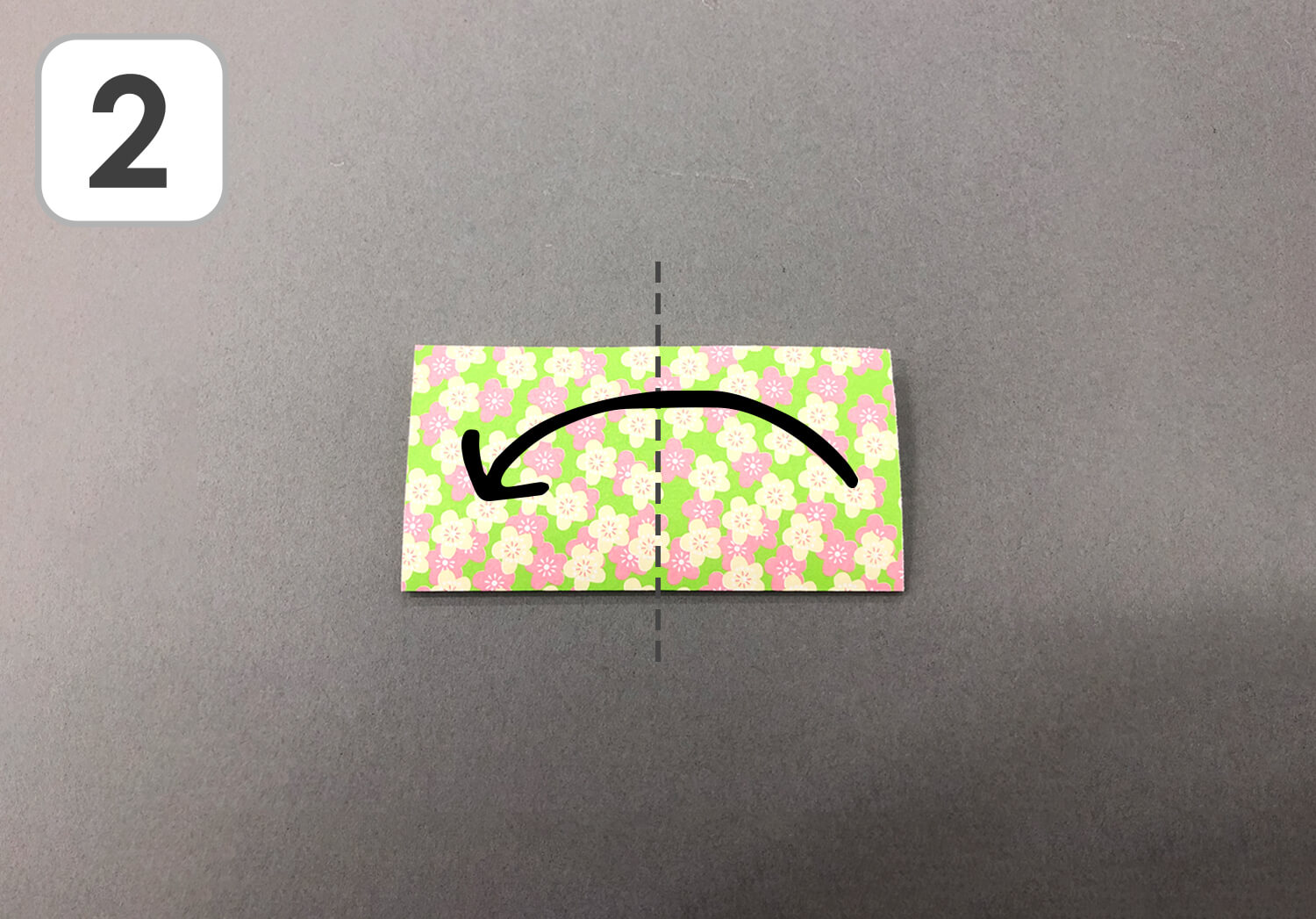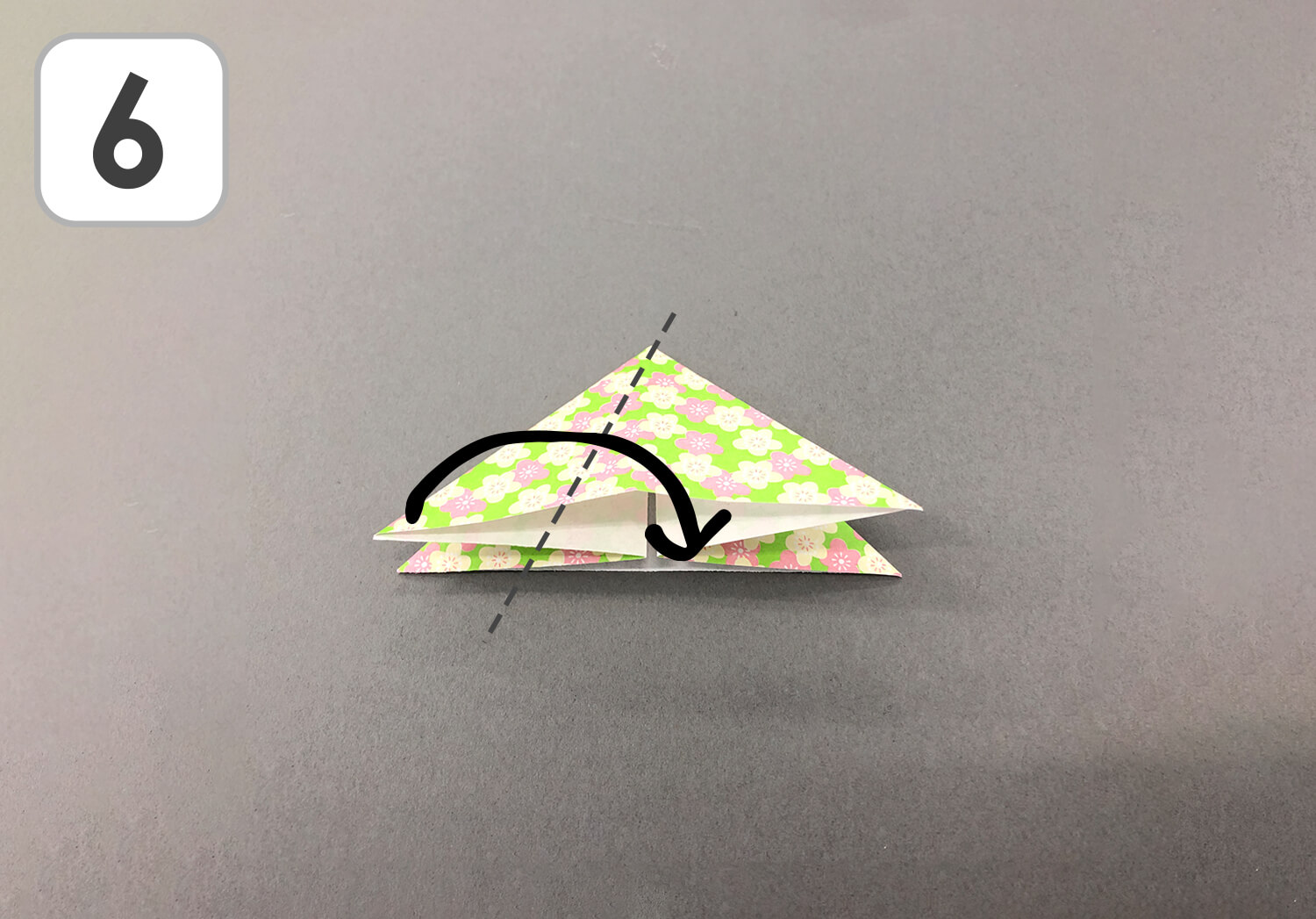 6.反対側も同様にふくろ折りをしたら、点線にそって上の1枚だけを折っていきます。