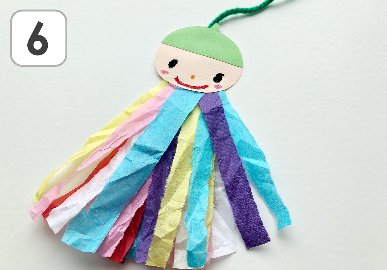 ⑥ クレパスで顔を描いて、お花紙を好きな長さに切って調節すれば…可愛いみのむしの完成です!