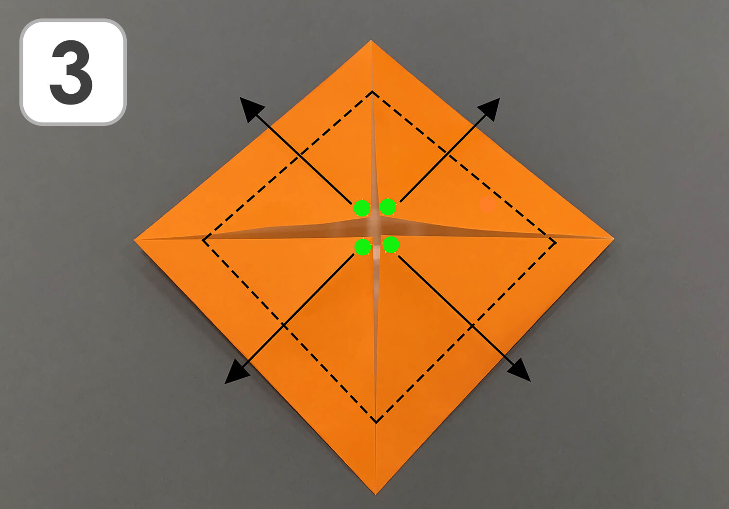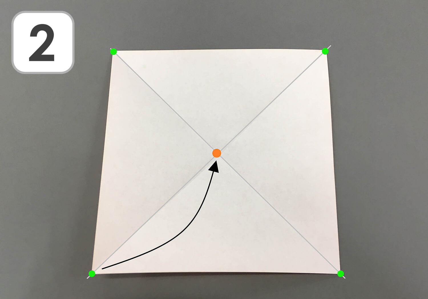 ② 四つ角の先(緑の●)を、折り目の中心(オレンジの●)へ合わせるように折ります。