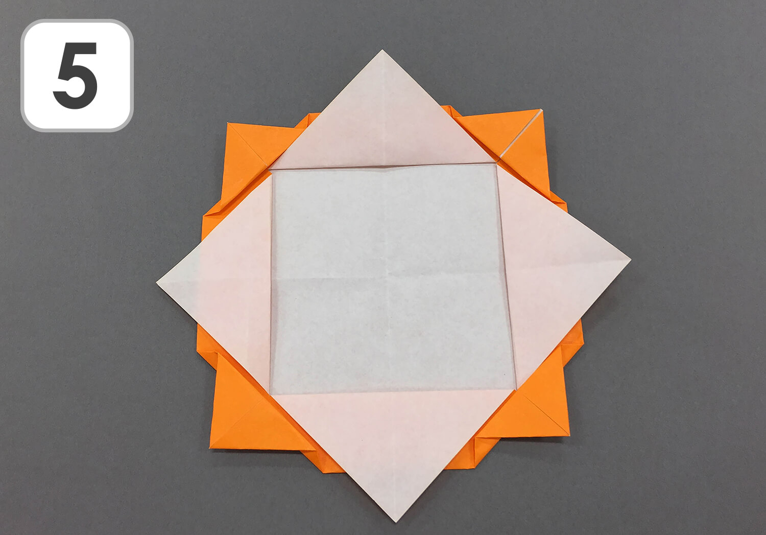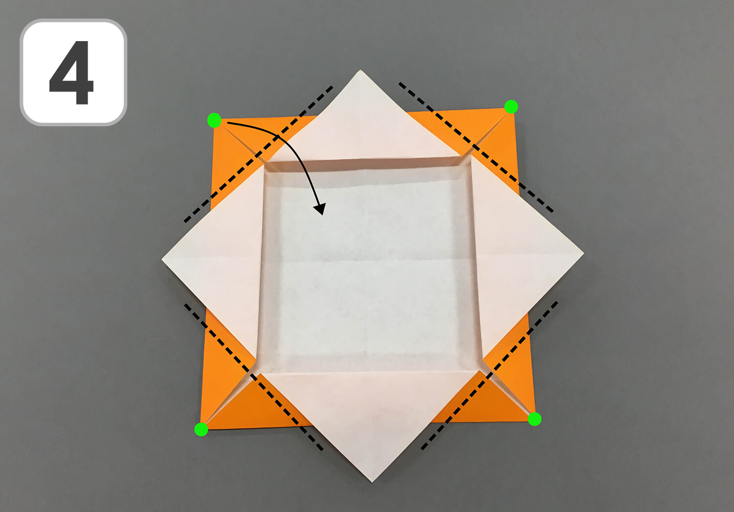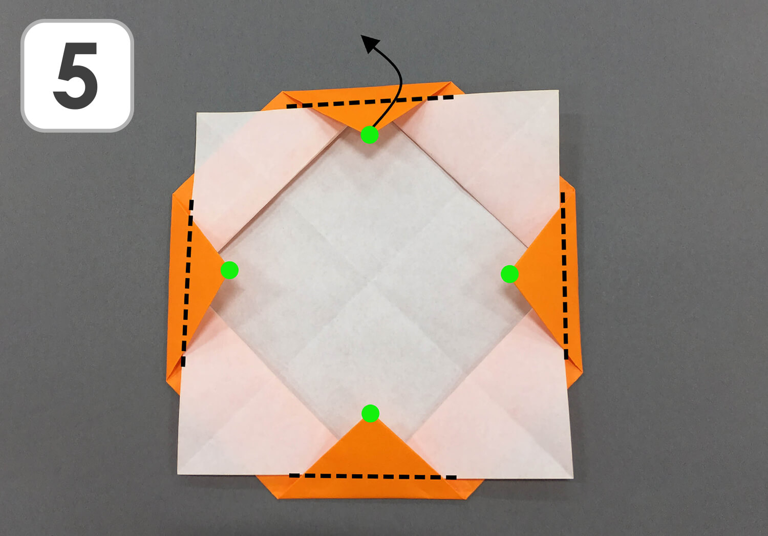 ⑤ 四つ角の先(緑の●)が外に出るように、点線に沿って折ります。