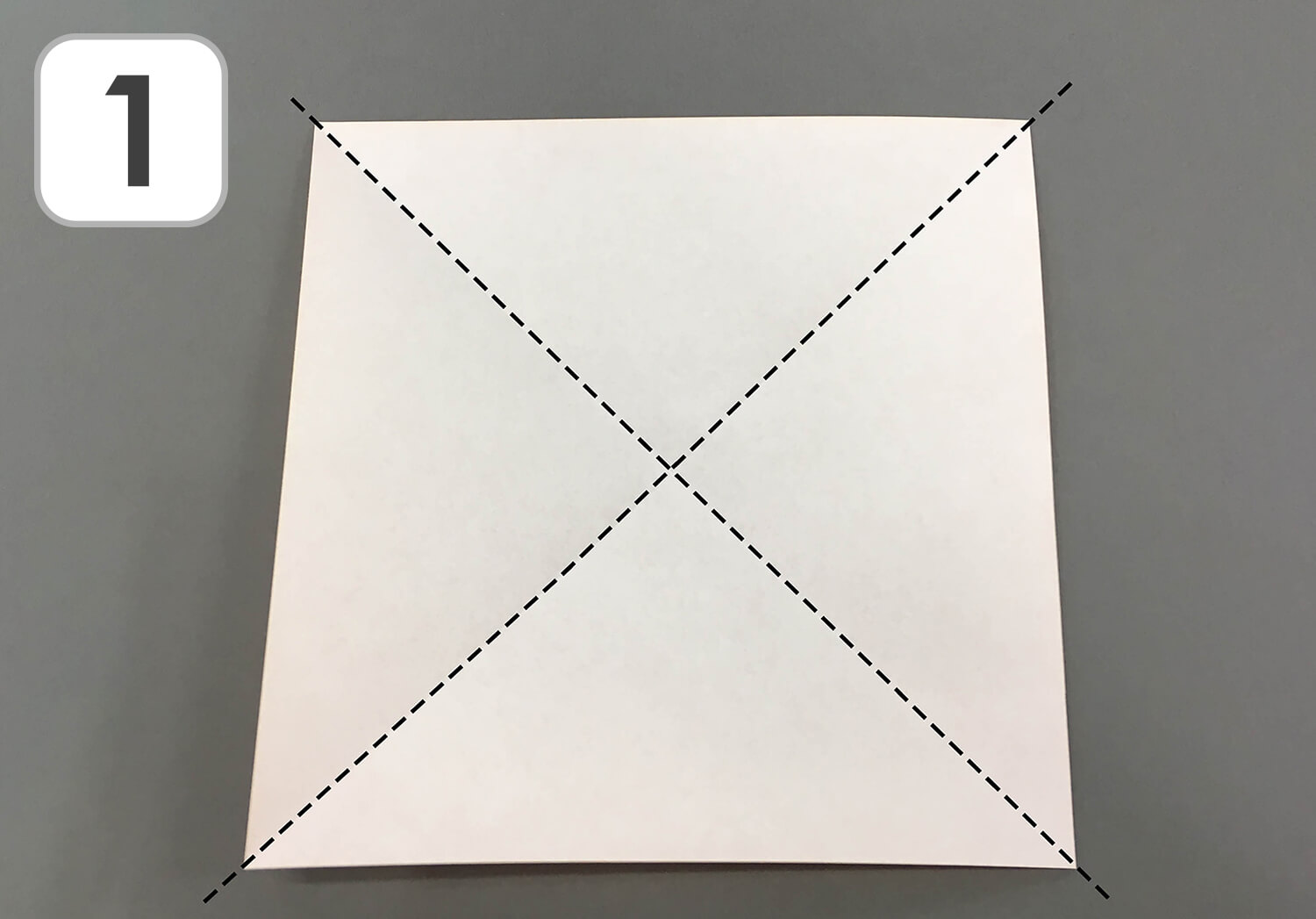 ① さんかくに2回折り、折り線を付けて開きます。