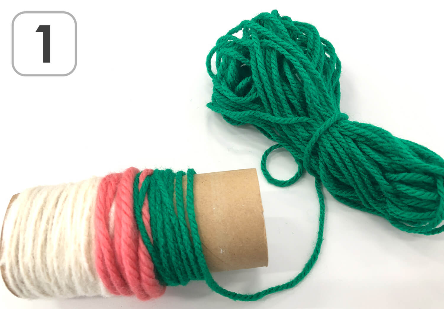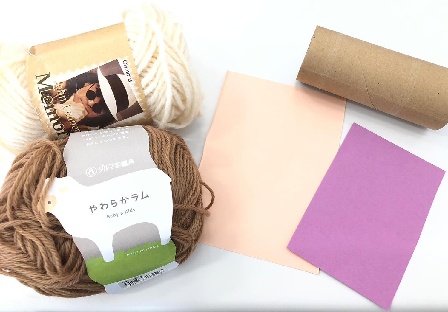 ① ボンドを使って毛糸をトイレットペーパーの芯にグルグルと、好きなだけ好きなように巻いていきます。