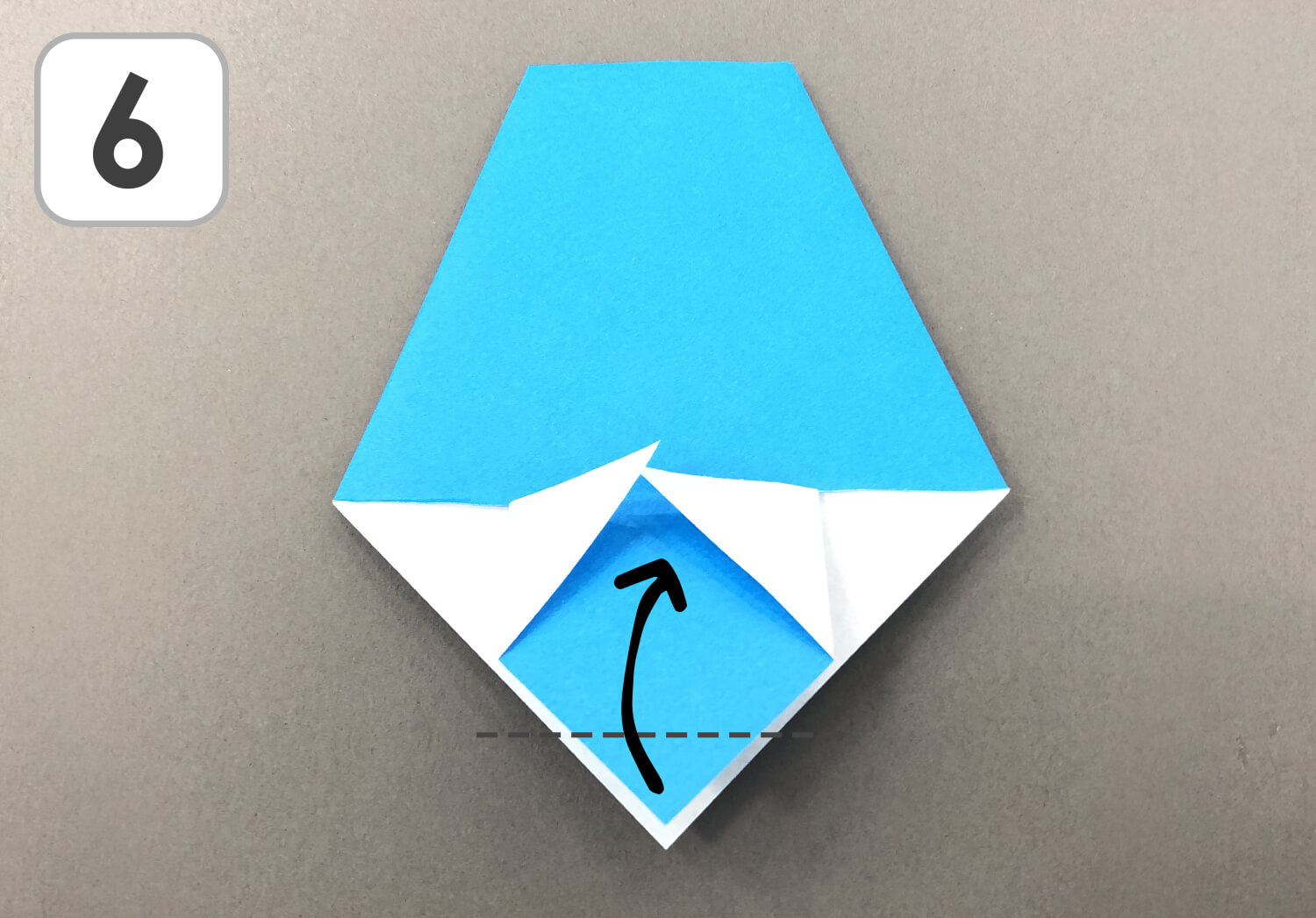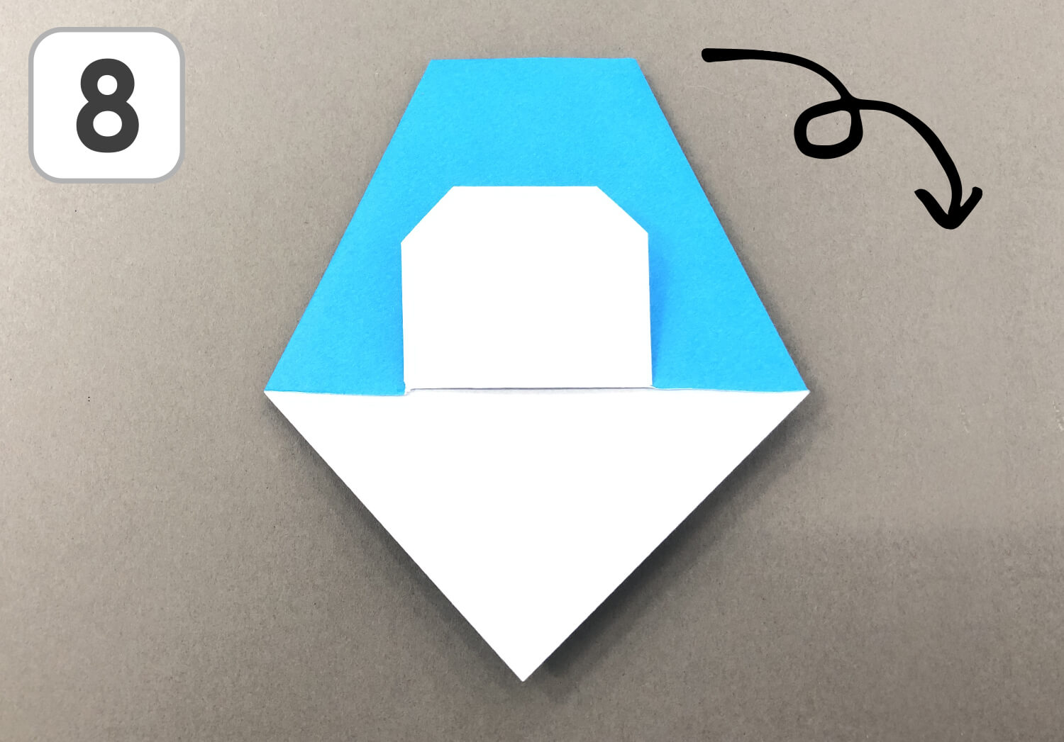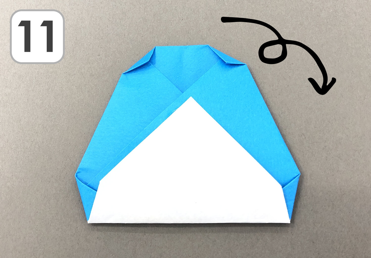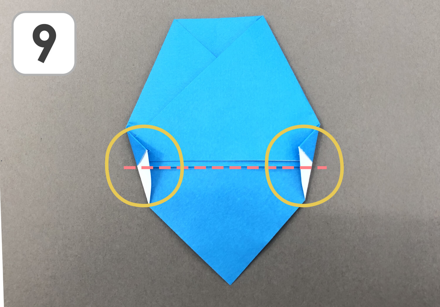 ⑩ 点線に沿って折り、頭の部分の角を落としていきます。