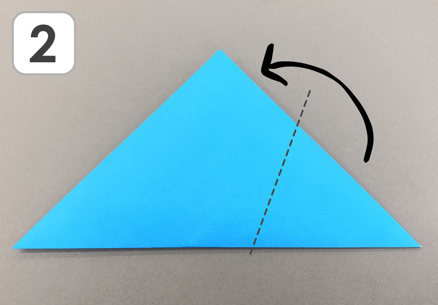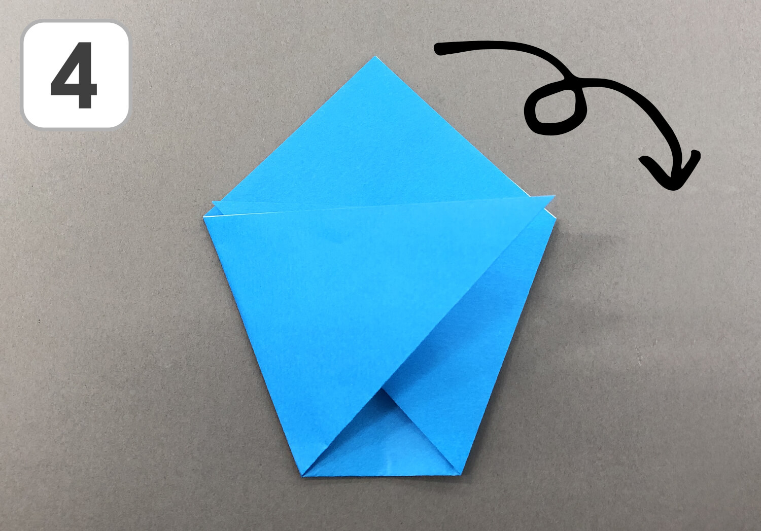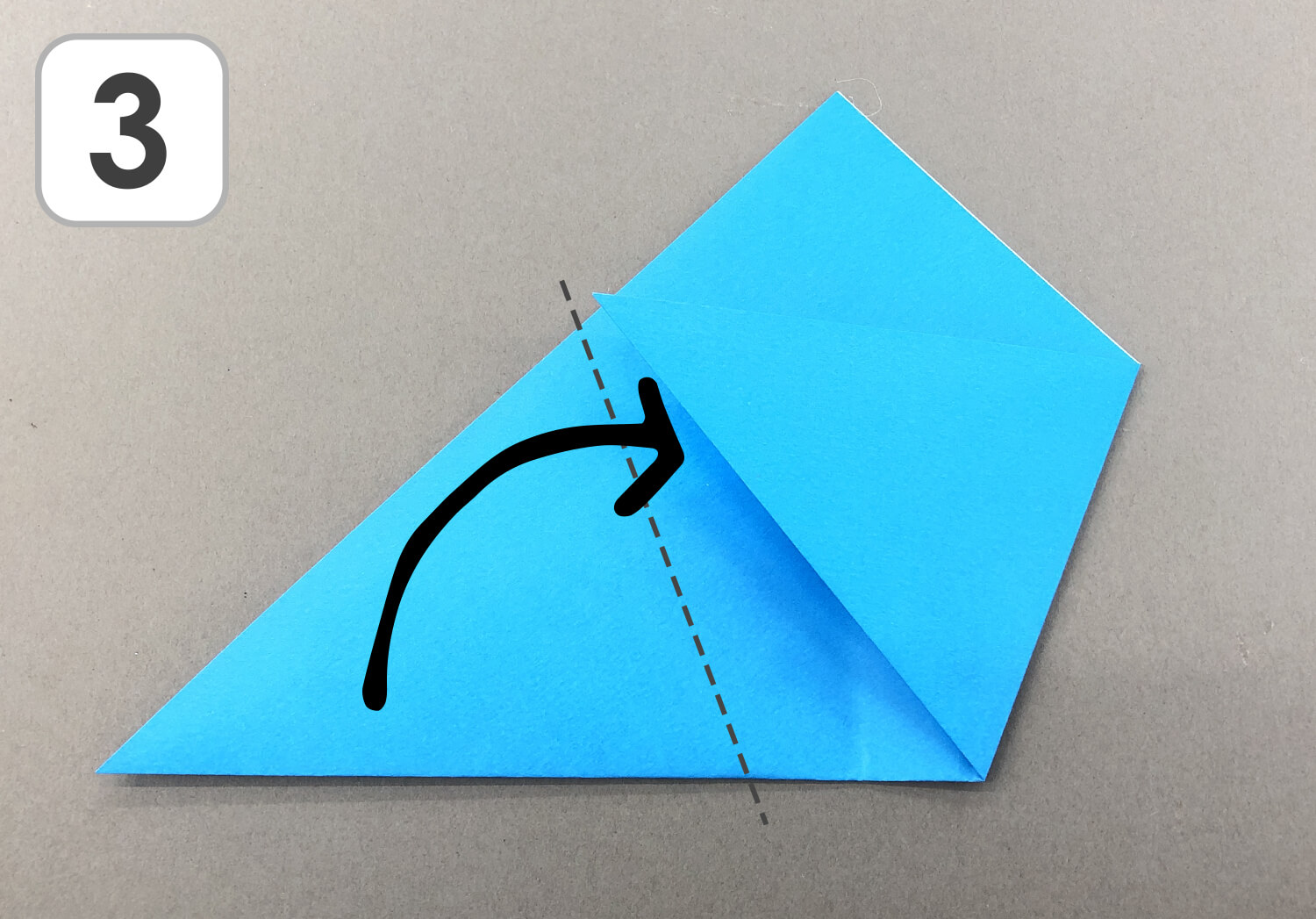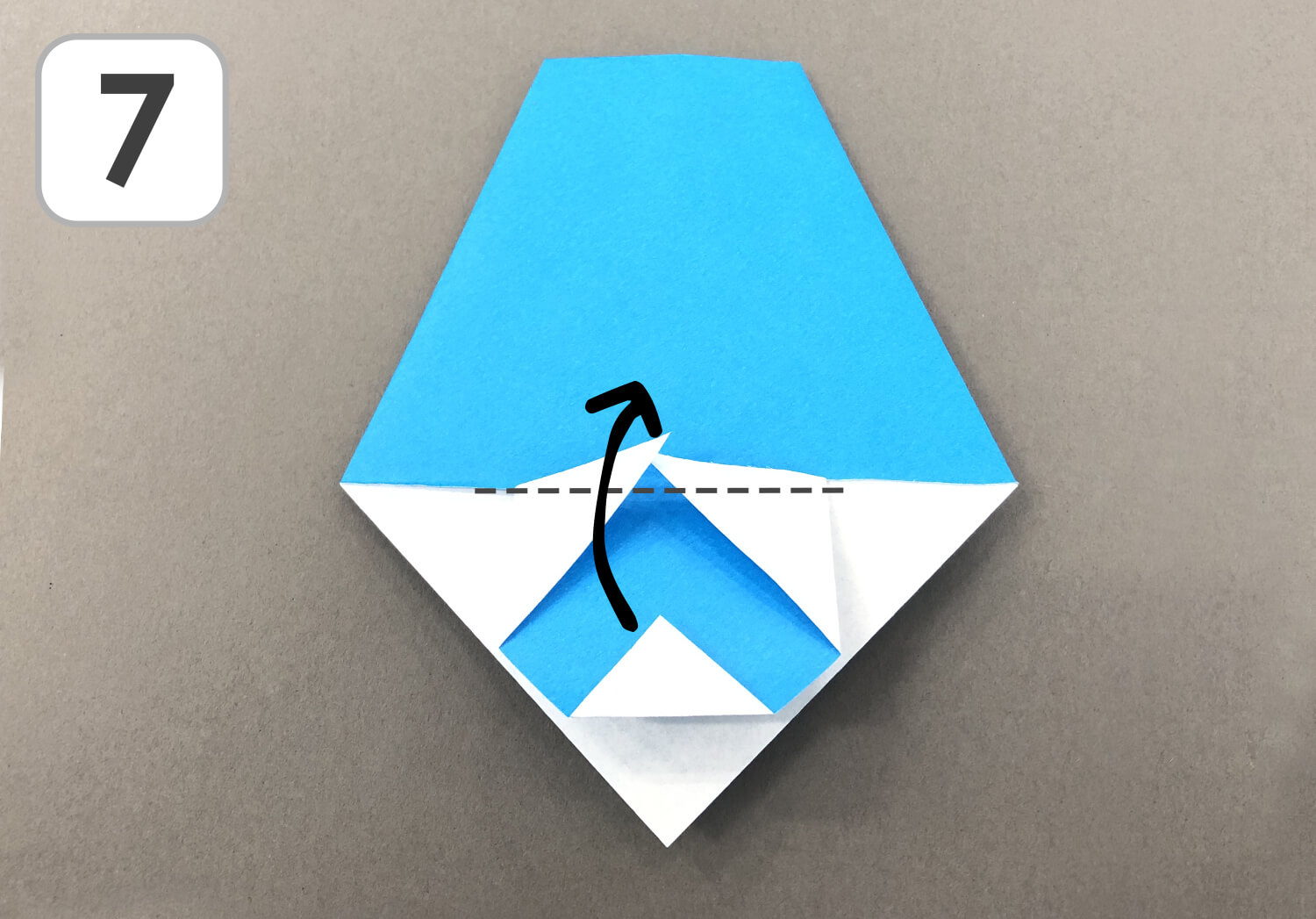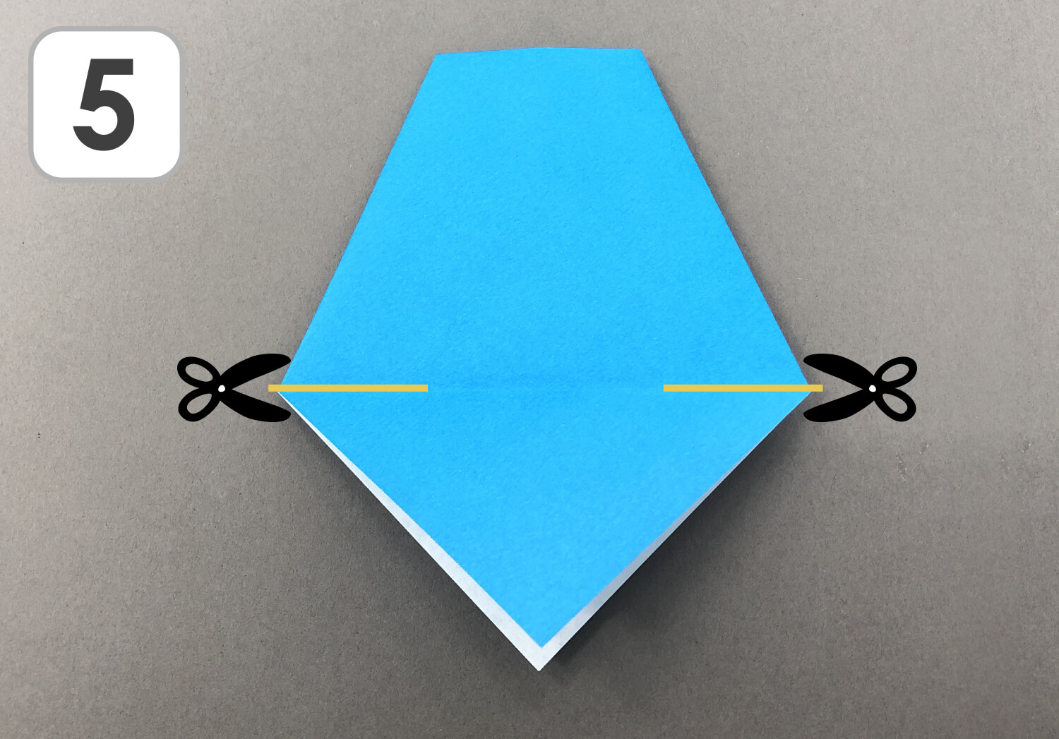 ⑩ 点線に沿って折り、頭の部分の角を落としていきます。