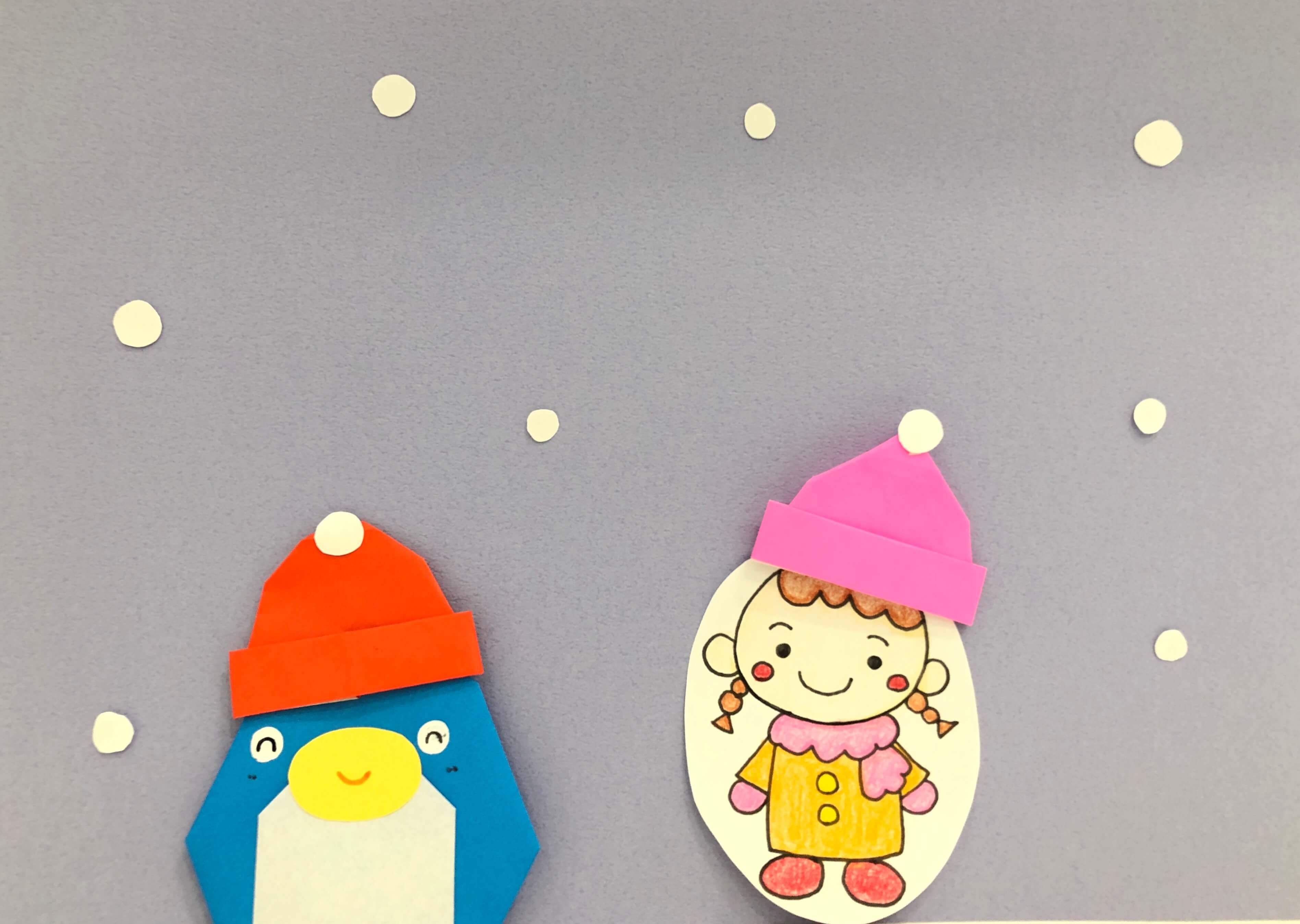 作ったペンギンに1/4サイズのおりがみで折った帽子をかぶせて、冬の壁面らしくてみました◎