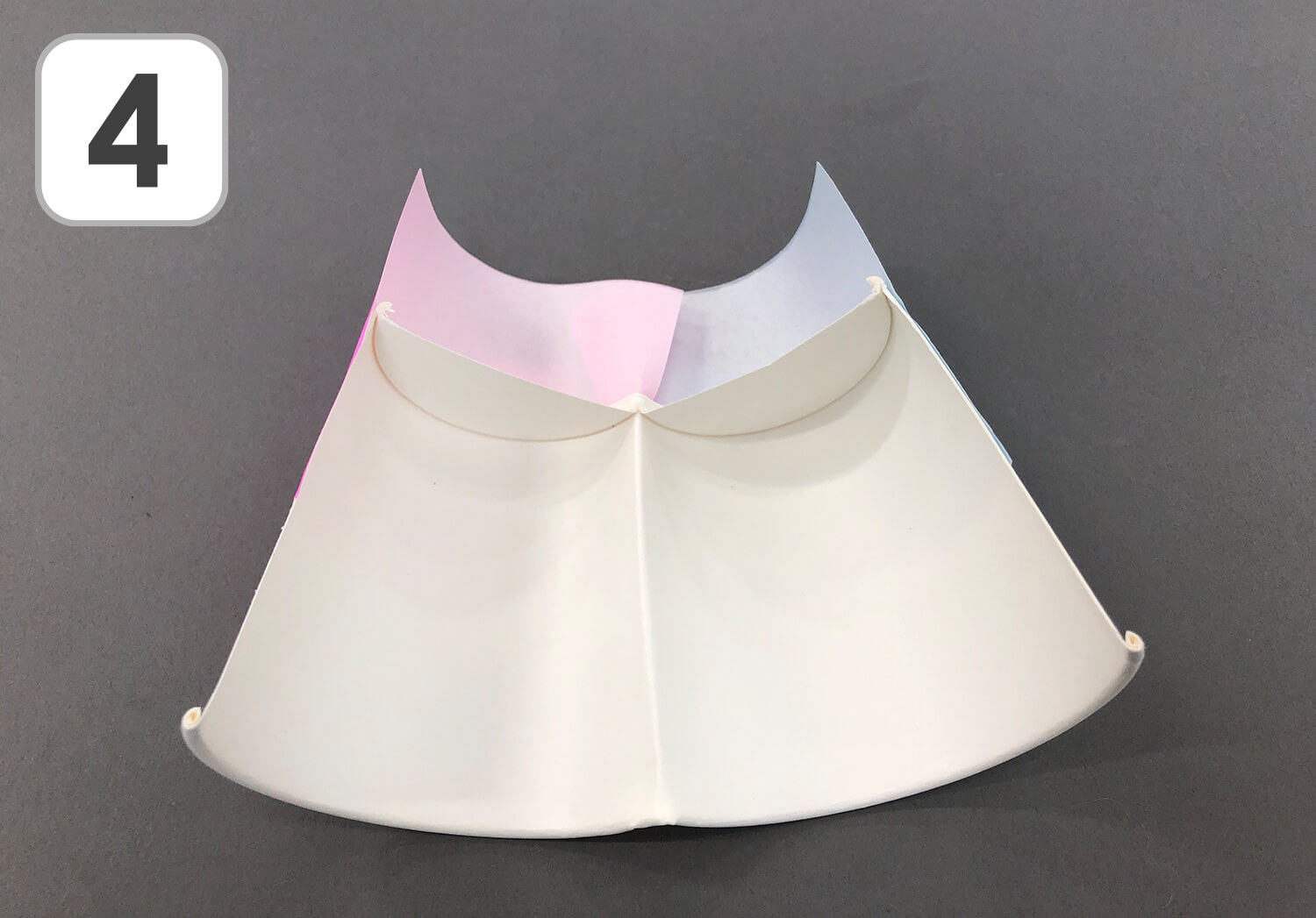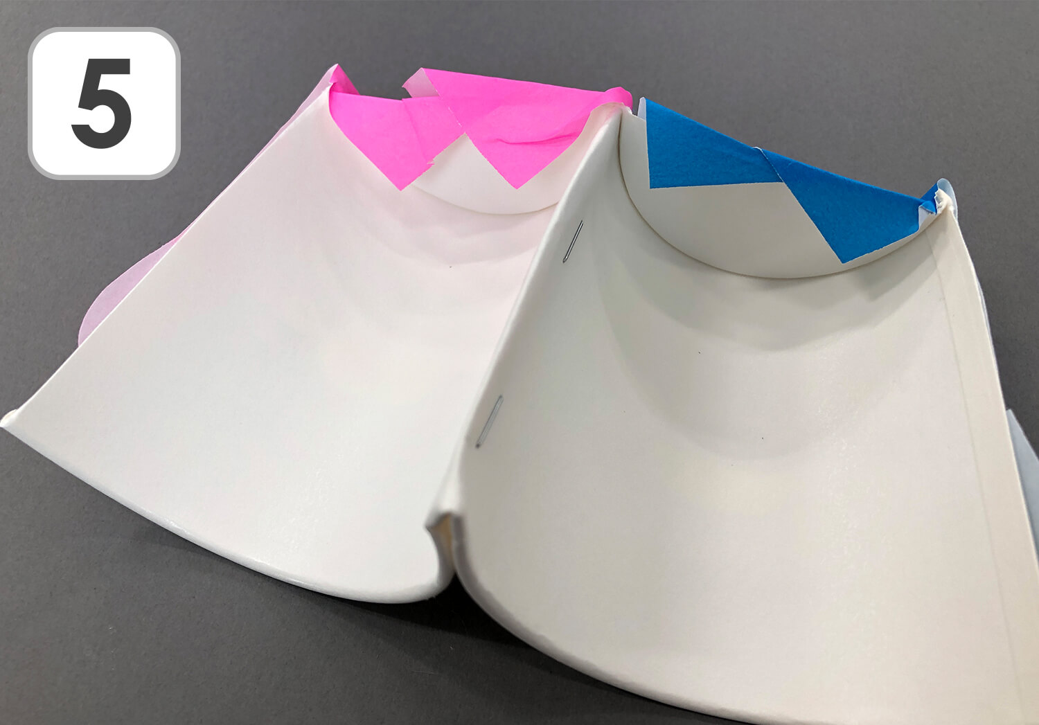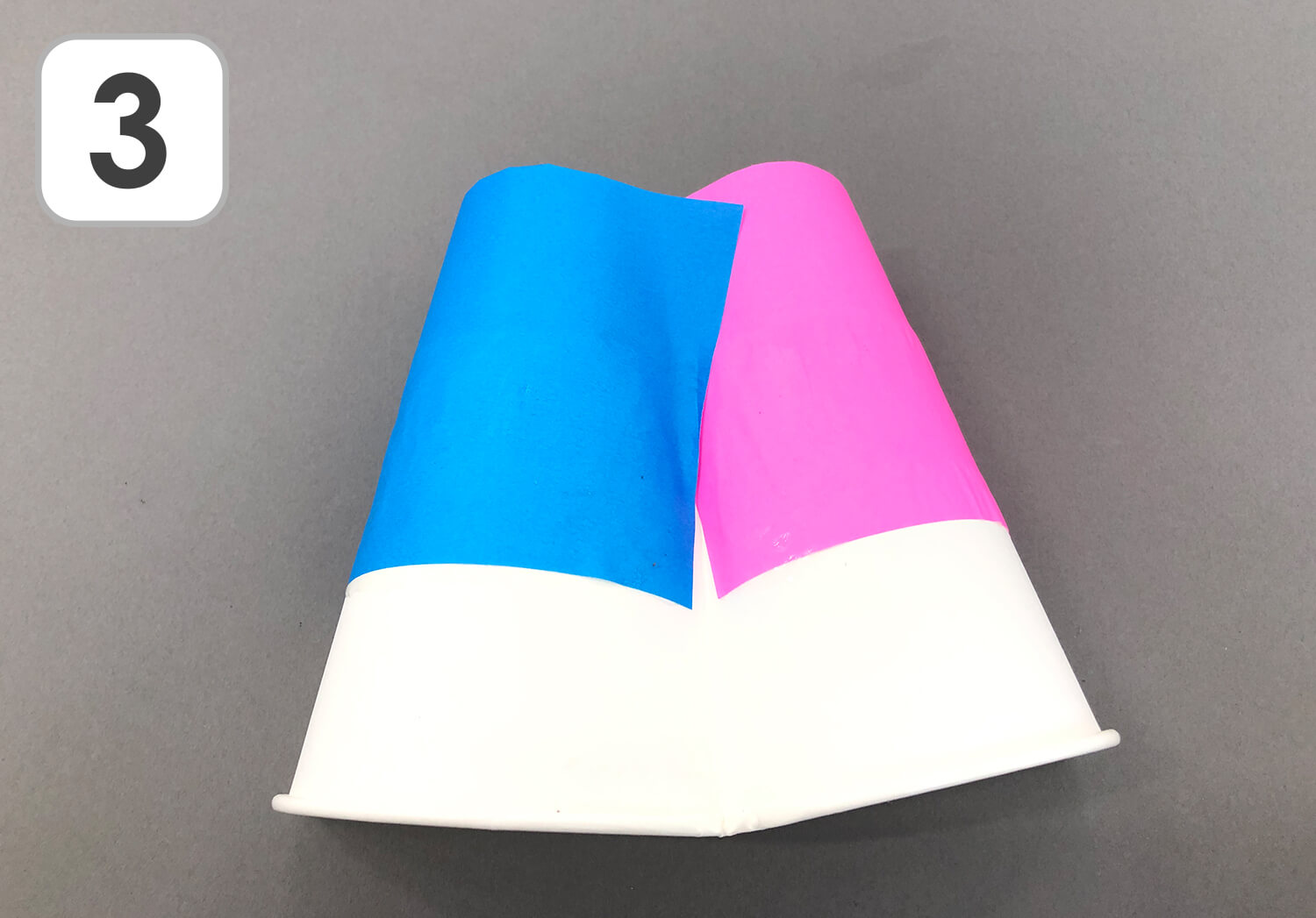 ③ おりがみにのりをつけて紙コップの開いた折り線の左右に貼っていきましょう。