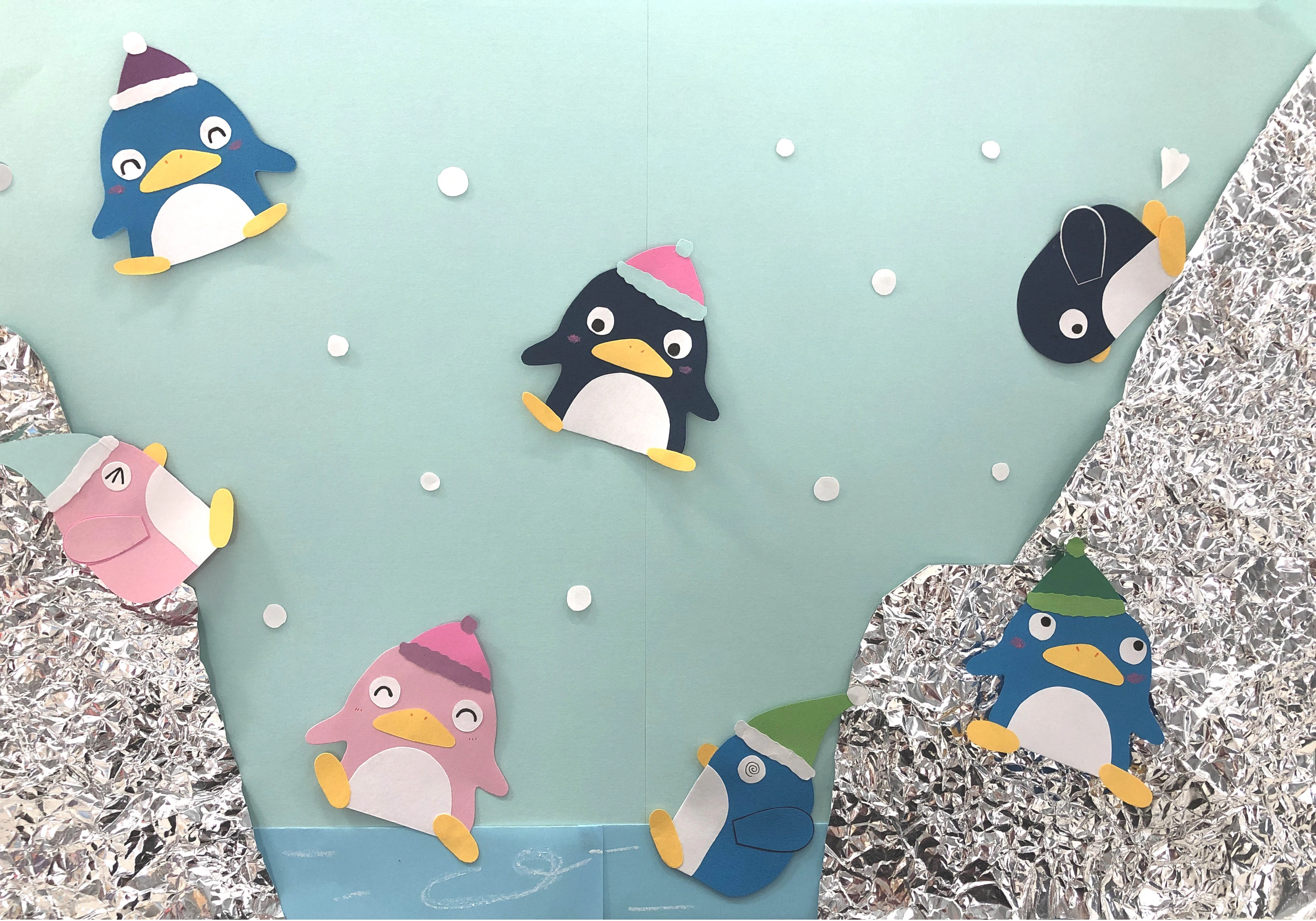 作ったペンギンに1/4サイズのおりがみで折った帽子をかぶせて、冬の壁面らしくてみました◎