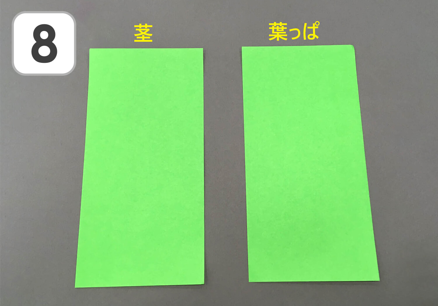 ⑧ 茎部分を作っていきます。一枚の折り紙を半分に切り、茎と葉っぱ用に分けます。