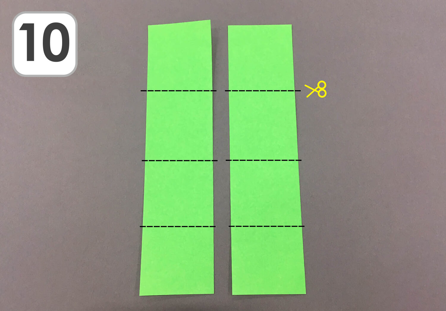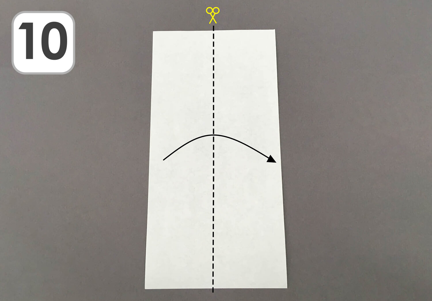 ⑩ ⑧で長方形になった折り紙を、線のように谷折りして開きます。そして折り線に沿ってはさみで切ります。