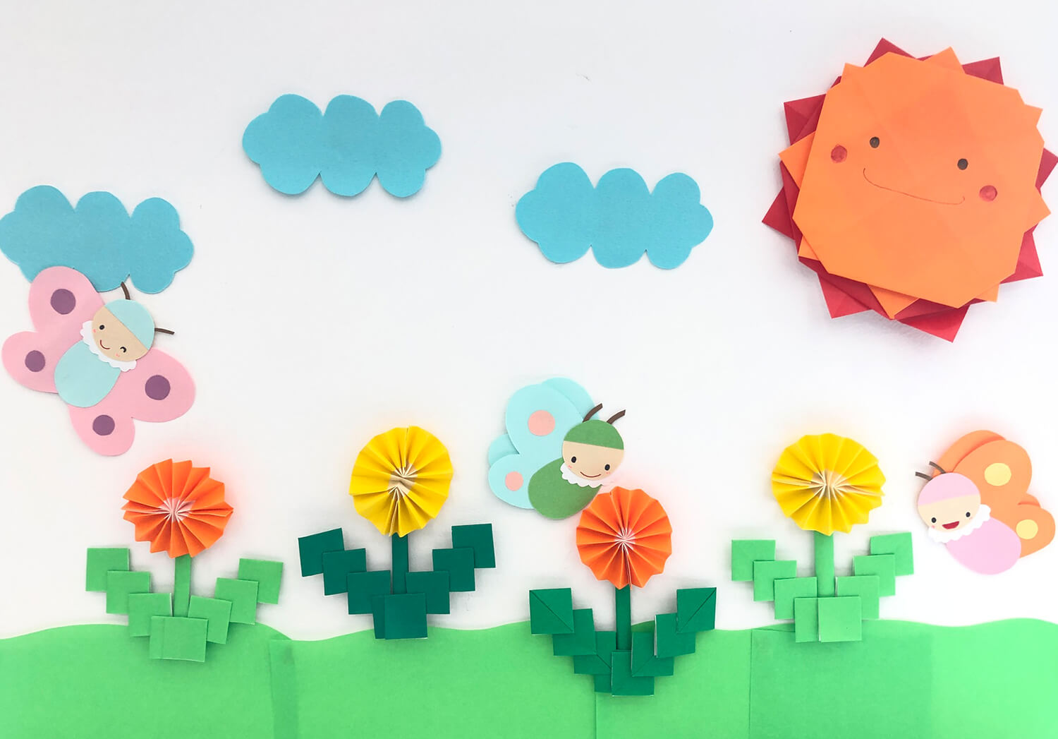 子ども達の作品を壁面にして保育室を可愛く彩ると、ぽかぽか春らしく楽しい雰囲気の壁面になりますよ。