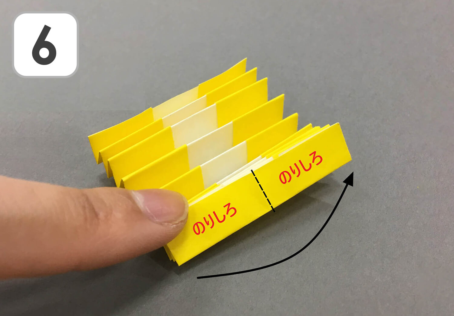 ⑥ 端の外側に“のり”をつけて中心線を谷折りし、のりしろ同士をくっつけます。