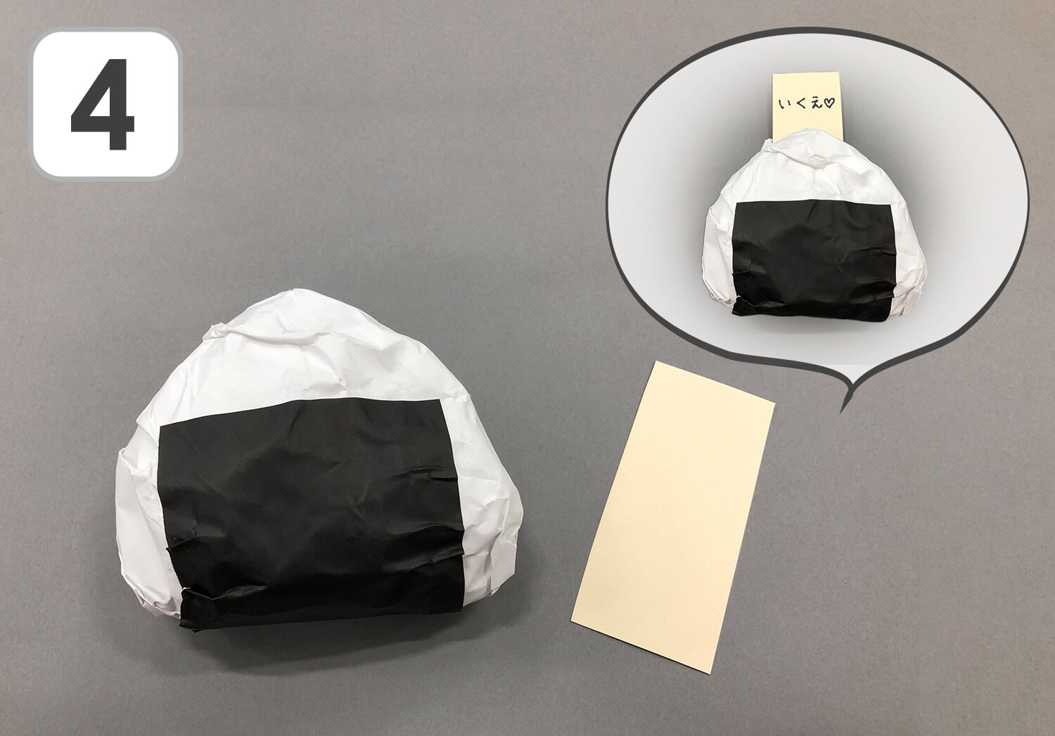 ③黒いおりがみの全面にしっかりのりをつけて、おにぎりにのりを巻まいたら完成です!!