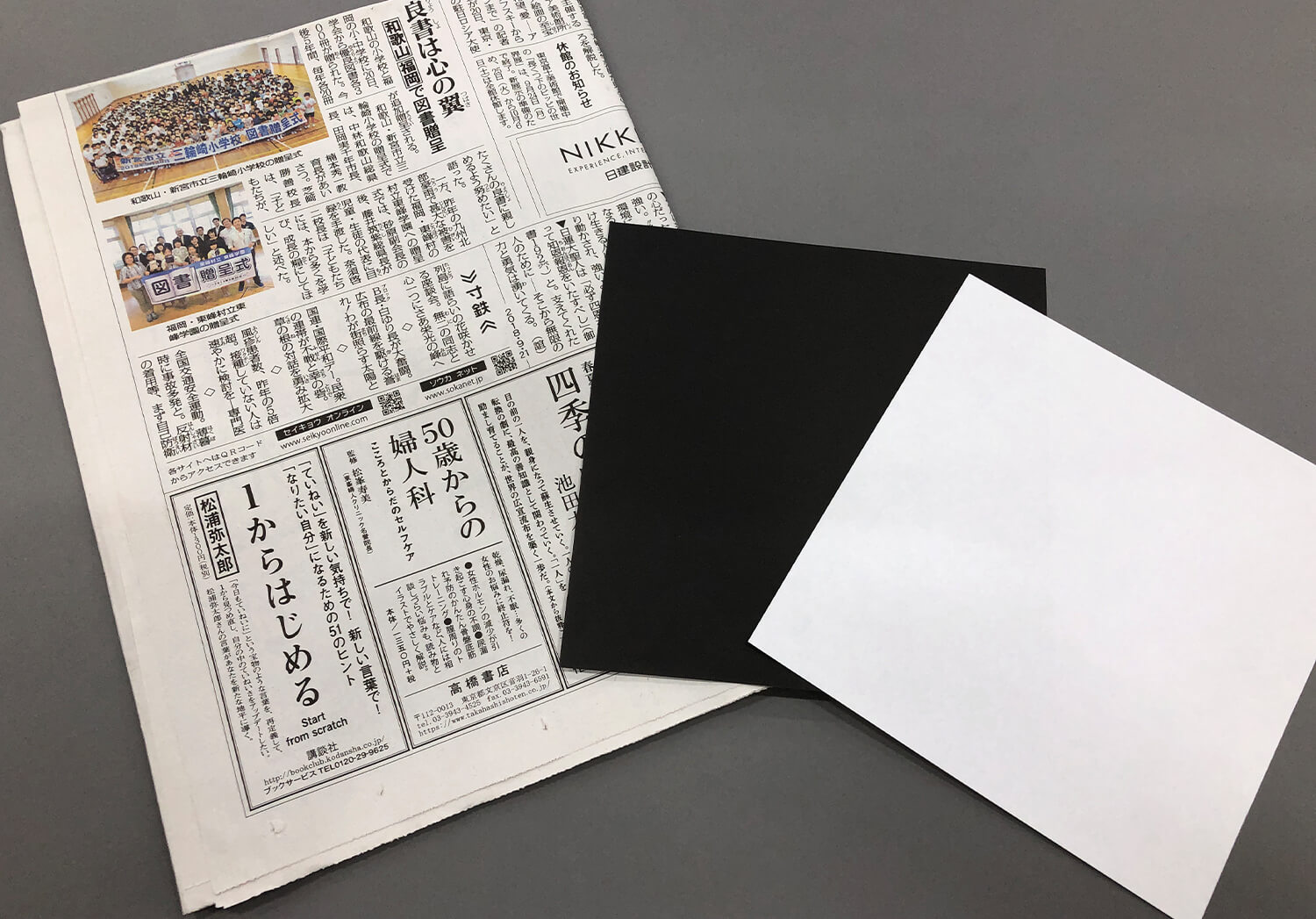 ② 白いおりがみの全面にのりをつけて、①で作った新聞紙を包むように貼っていきましょう。