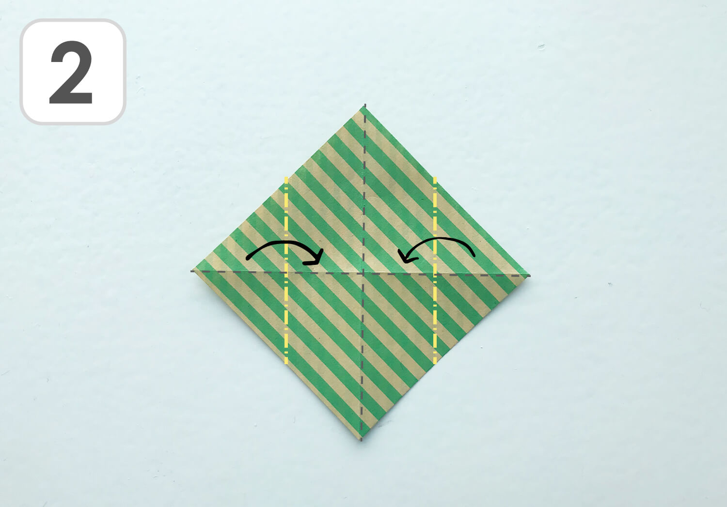 ② 柄のおりがみを三角に2回折り、折り目を付けて開いたら、真ん中に合わせて左右の角を折ります。