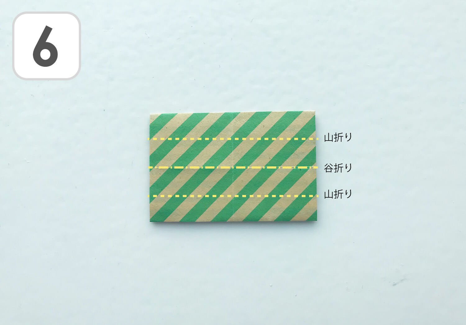 ⑥ 真ん中の点線を谷折り、上下の点線を山折りに折ります。