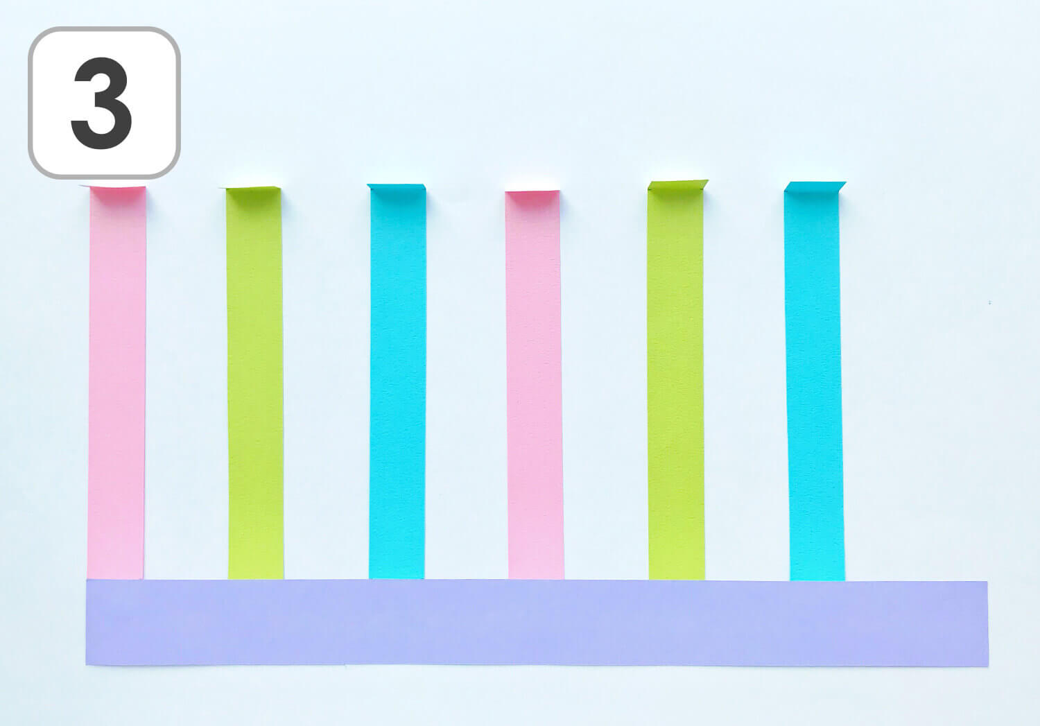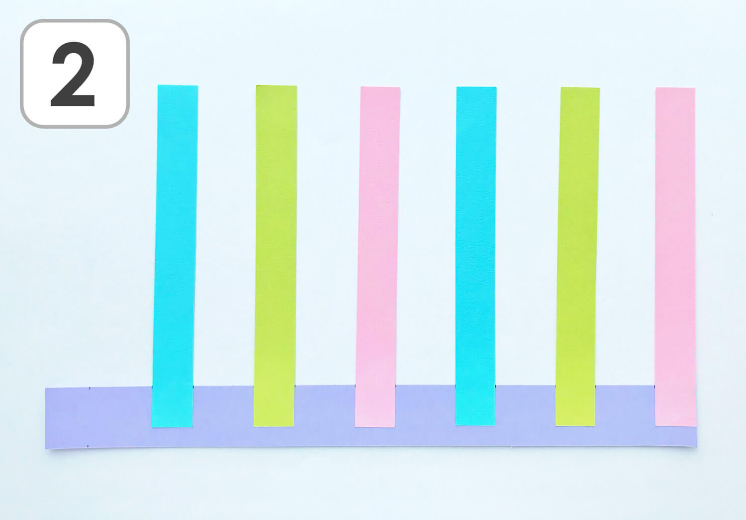 ② 土台となる横長のパーツ(紫)に、6本の縦長のパーツ(3色)を貼り付けます。