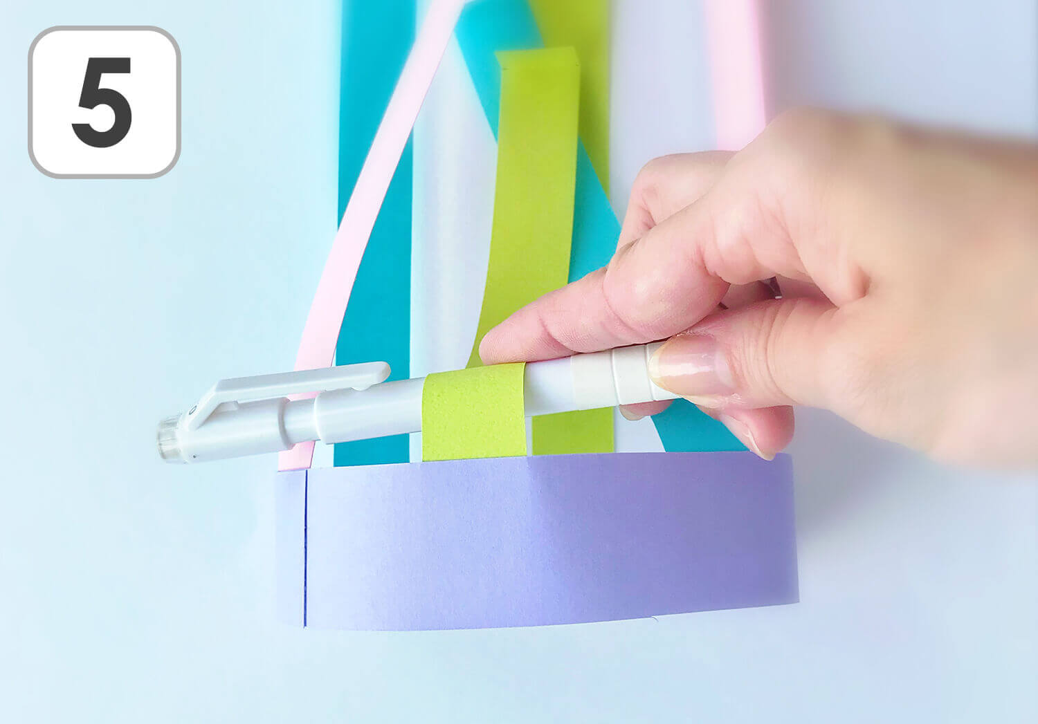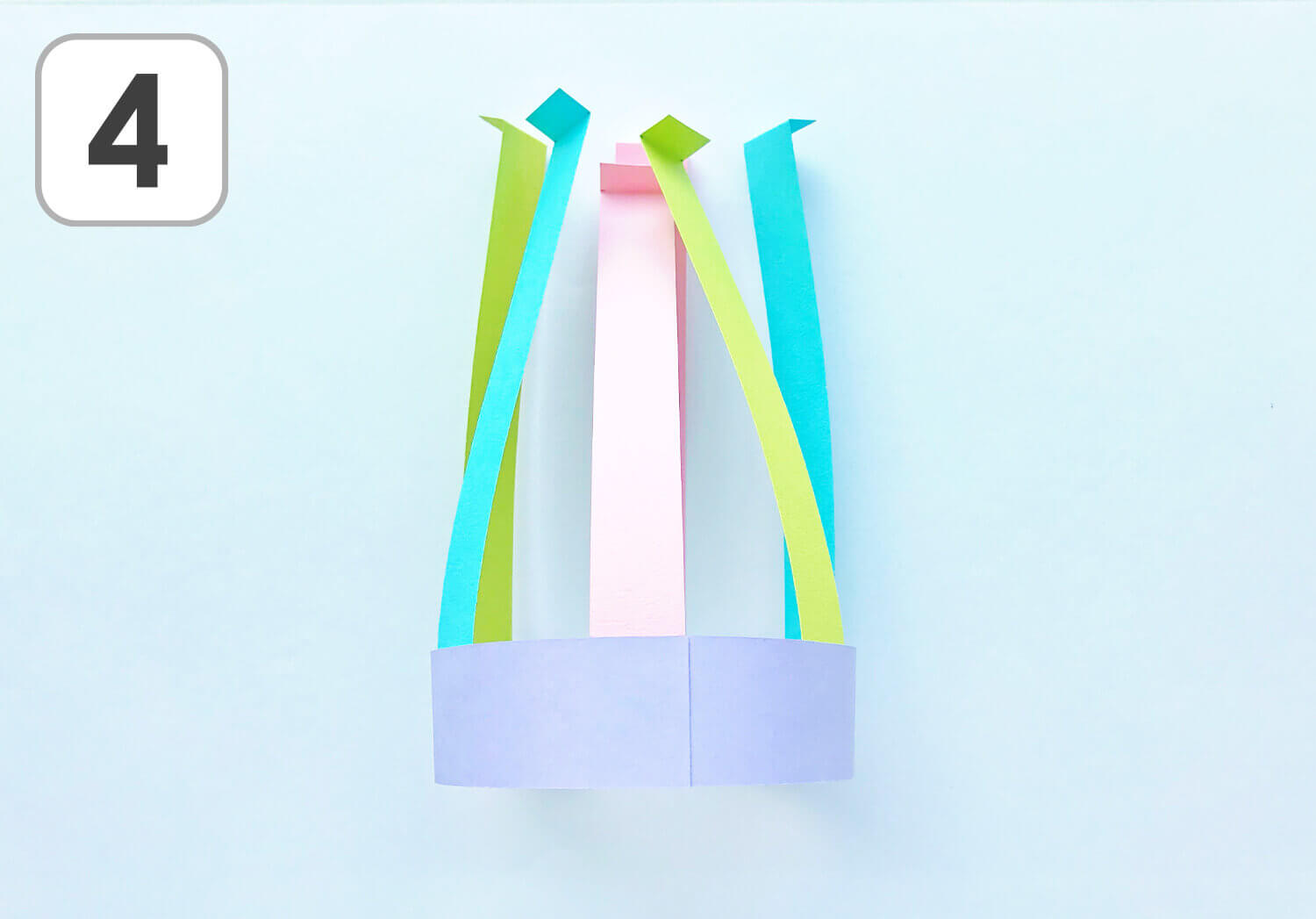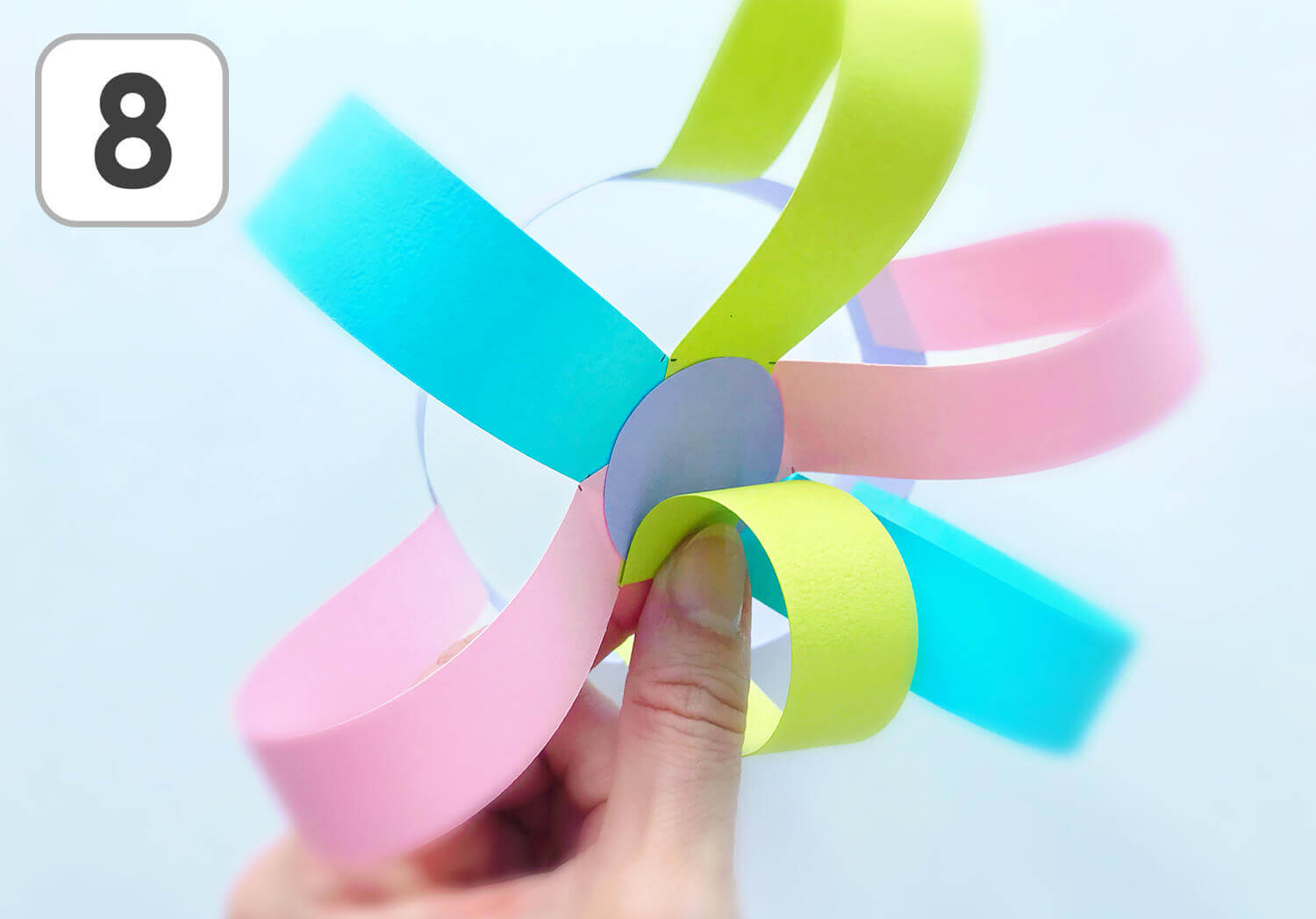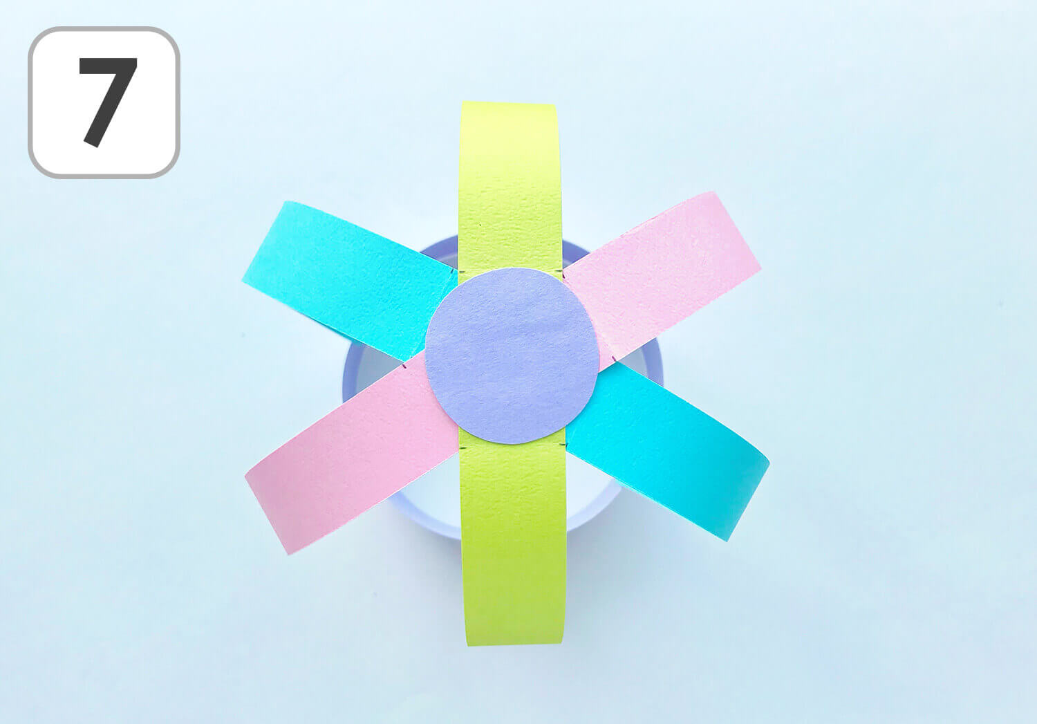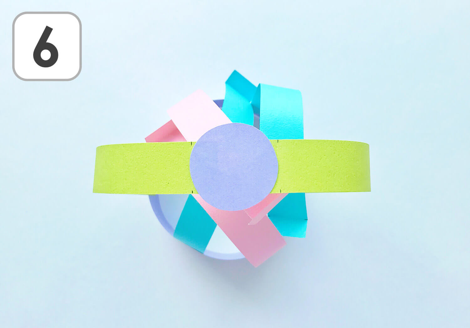 ④ 横長のパーツ(紫)の端と端をのりで張り合わせて輪っかにします。