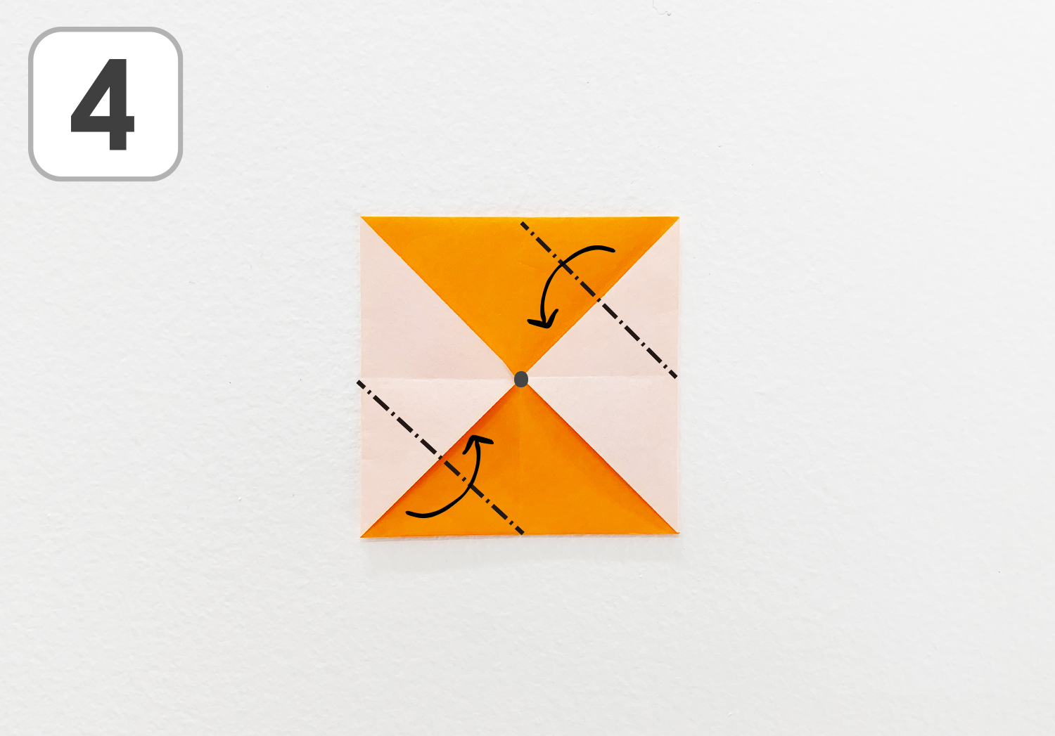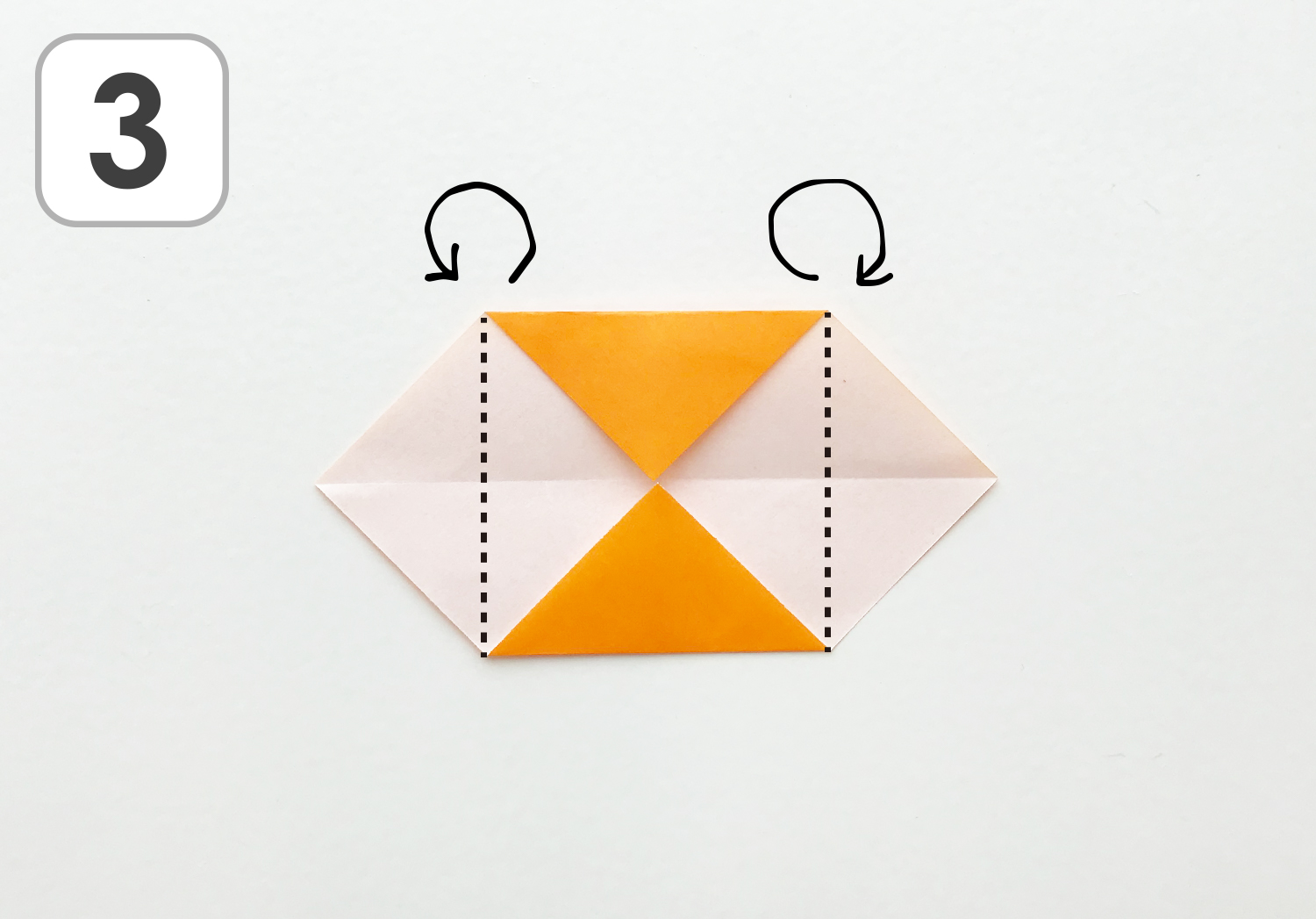④右上と左下の角を中心向かって点線で折ります。