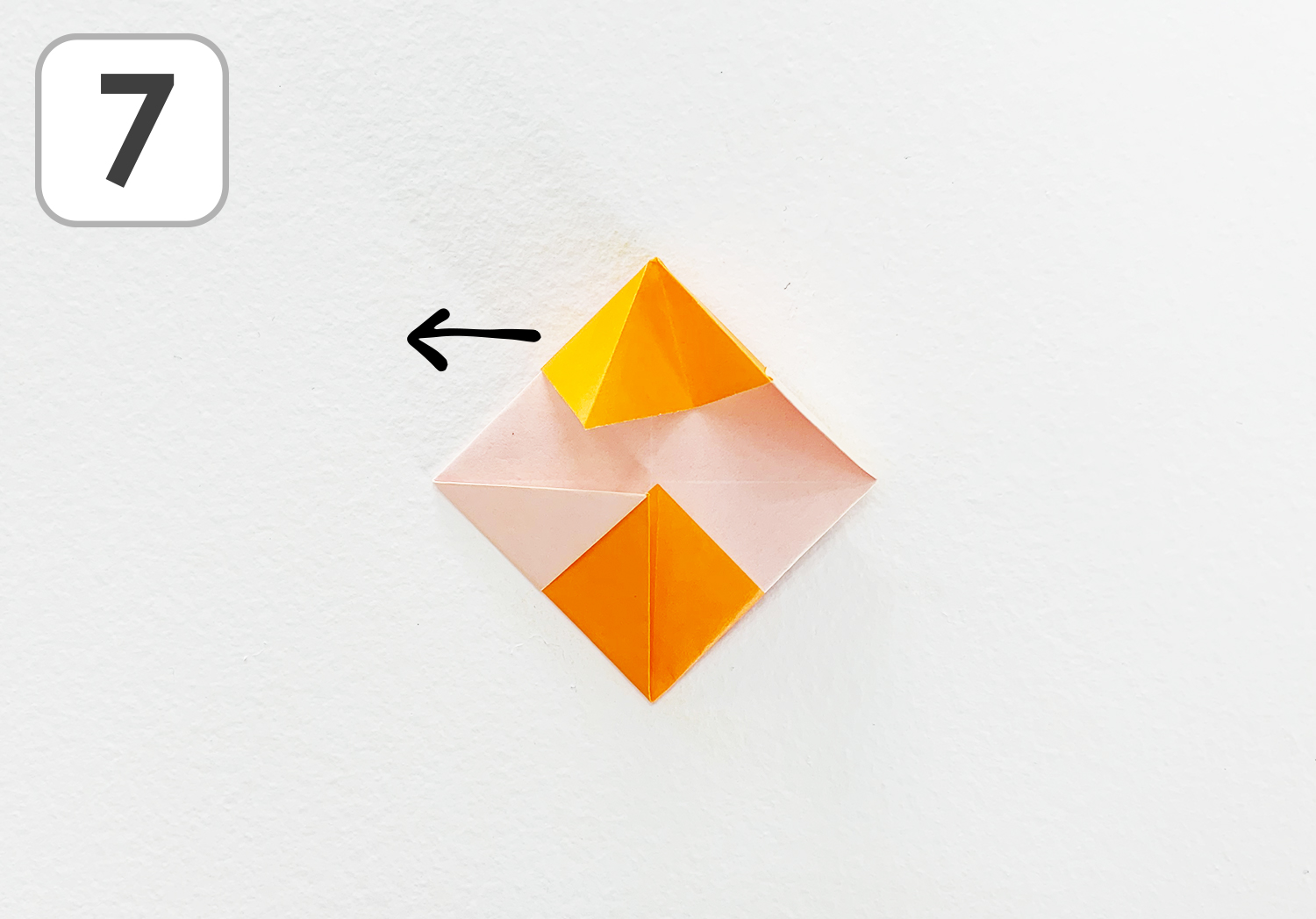 ⑦指を入れ持ち上げて、とんがりを左に引き出すようにして折ります。