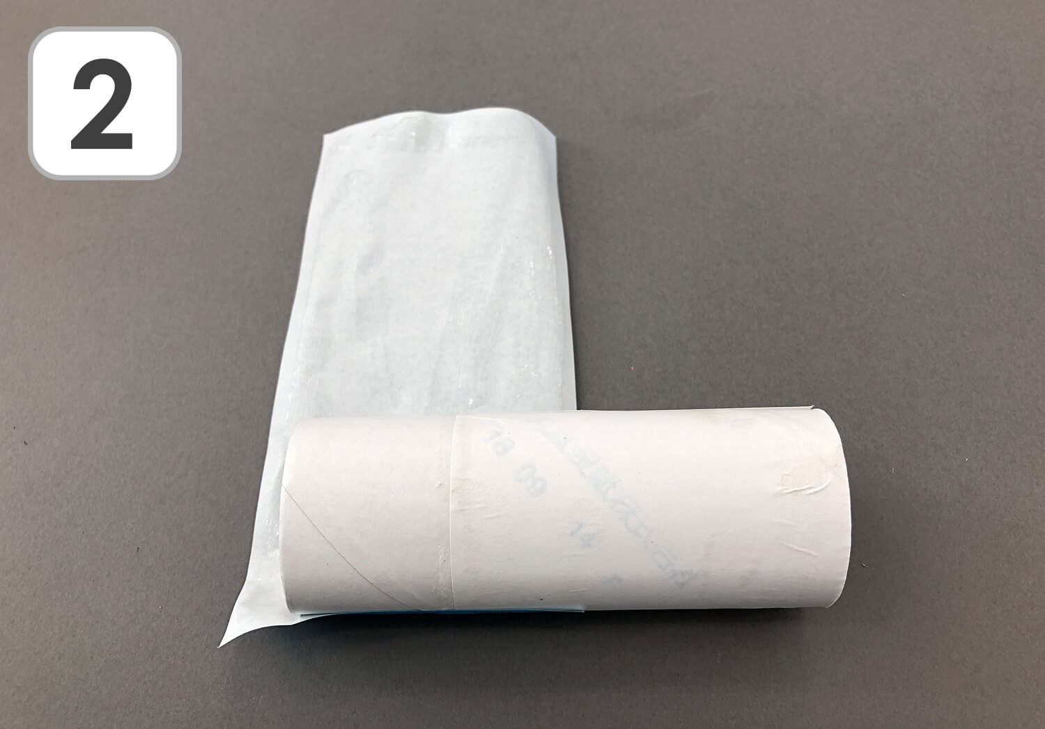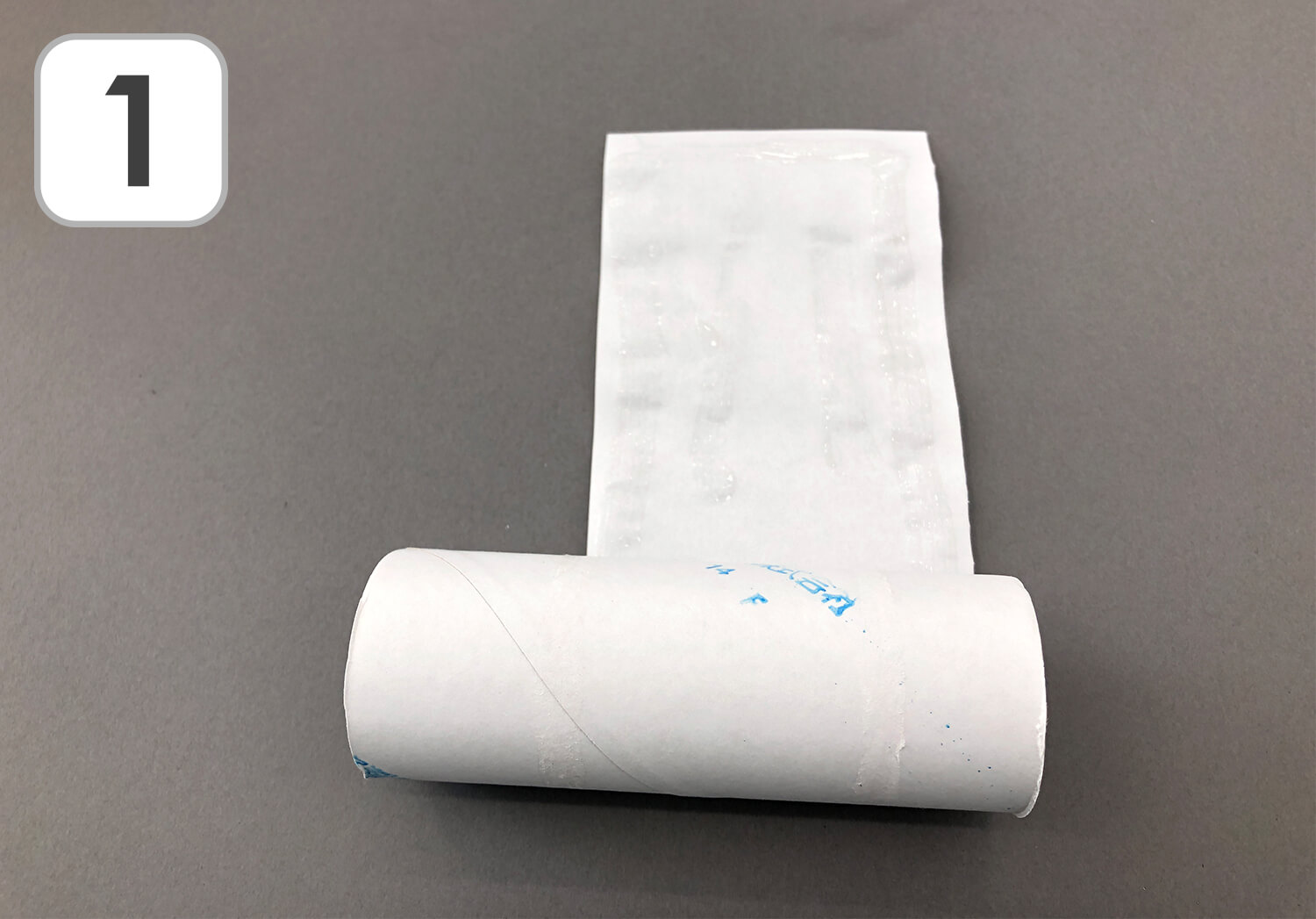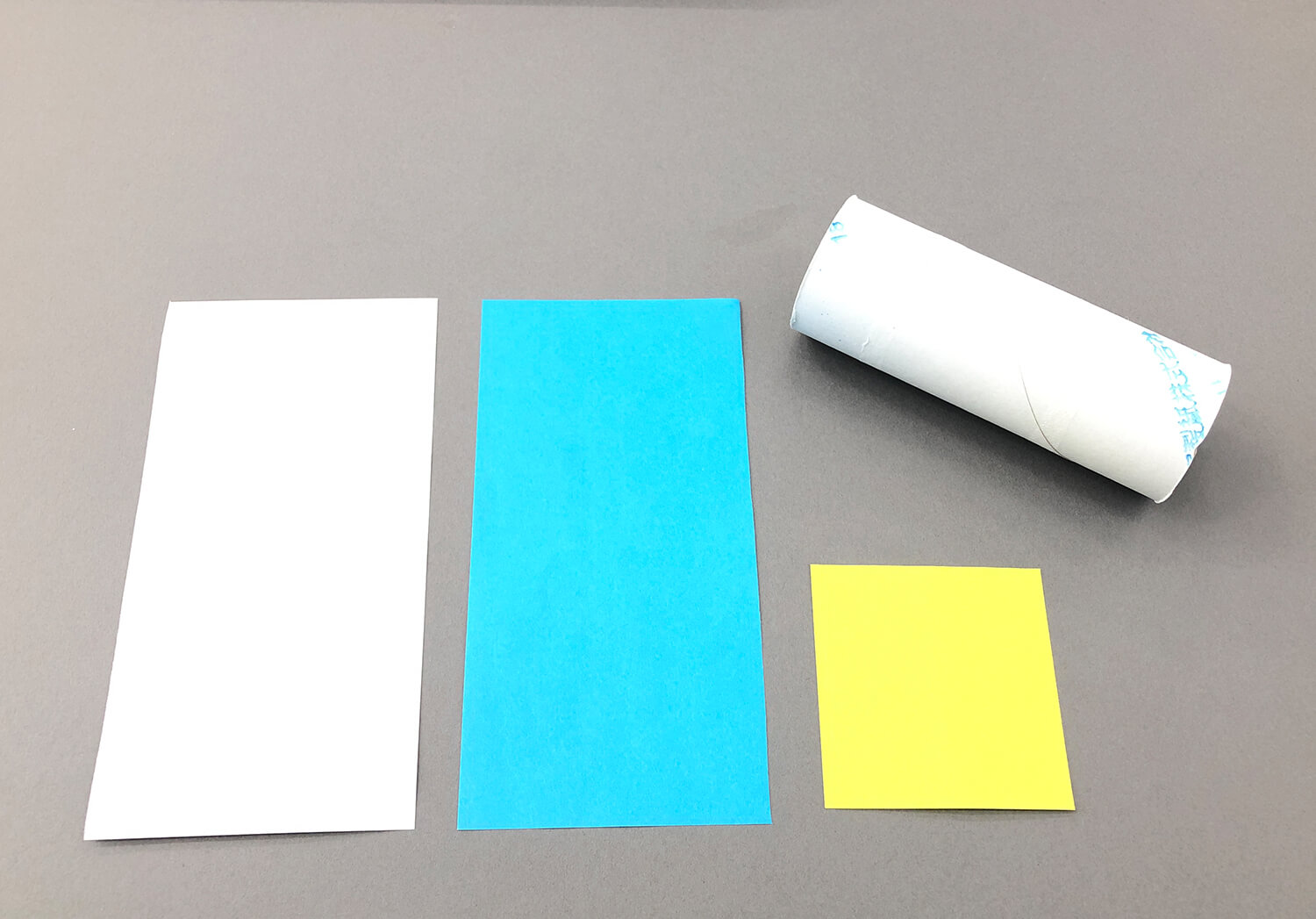 ① 1/2に切ったおりがみ(白)にのりをつけ、トイレットペーパーの芯にのどちらかの端に合わせて巻いていきます。