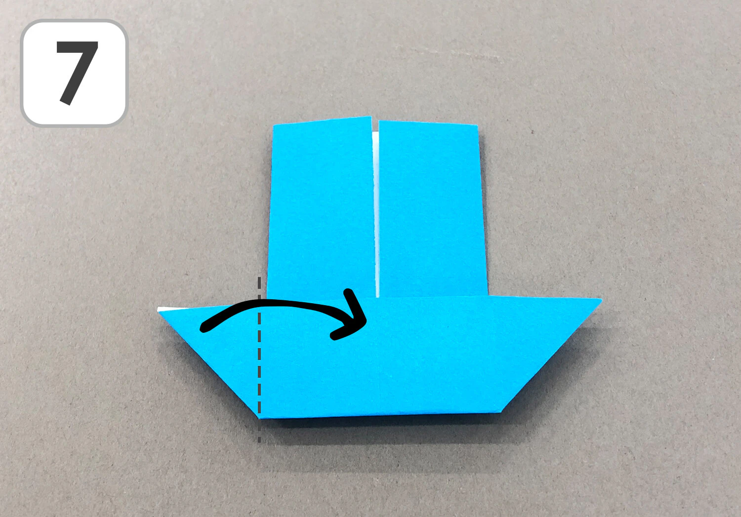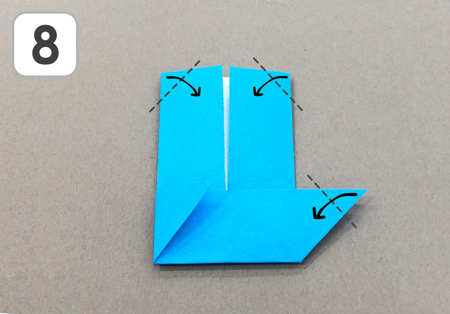 ⑦ 写真のような形になるので、次は点線に沿って折ります。