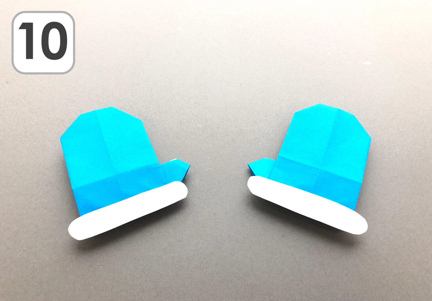 ⑩ 手袋の手首の部分に画用紙や綿を貼ってあげると、かわいい手袋の完成です!両手分作って、毛糸で左右を繋げても可愛いですね。両手を作る時には⑦で折る方向を逆にしてください。