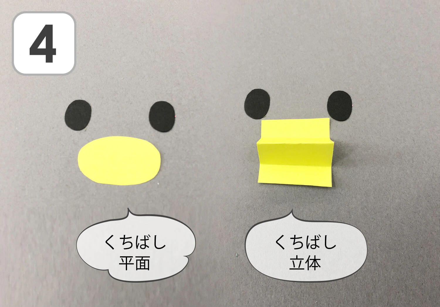 ④ 顔のパーツを切っていきます。くちばしは写真のように立体的にしてもいいですし、難しければ平面でもOK!やりたい方を選択させてあげて下さいね。