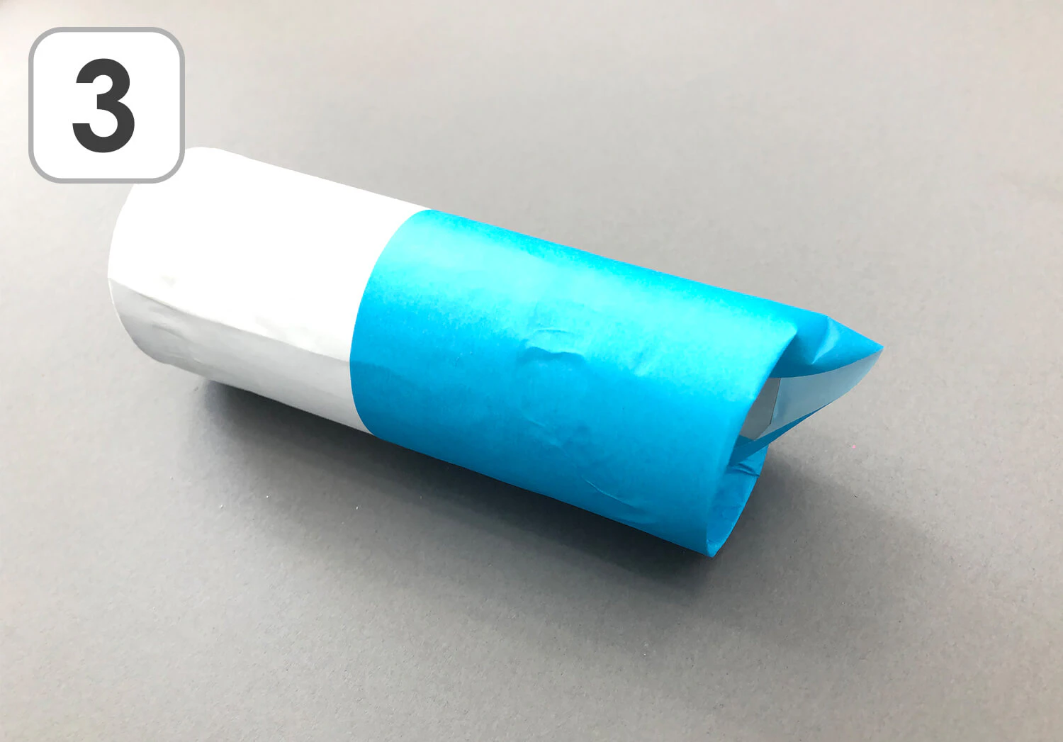 ③ 水色のおりがみを巻き終わったら、トイレットペーパーの芯からはみ出している部分をトイレットペーパーの芯の内側に折り込んでいきましょう。
