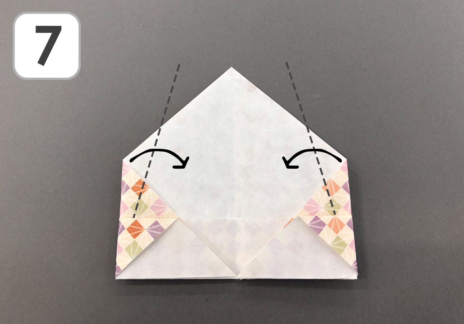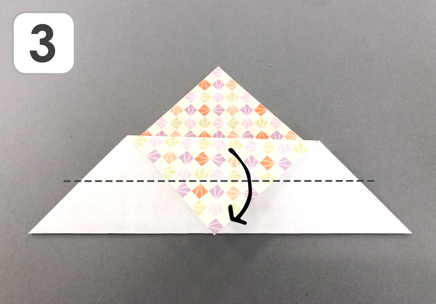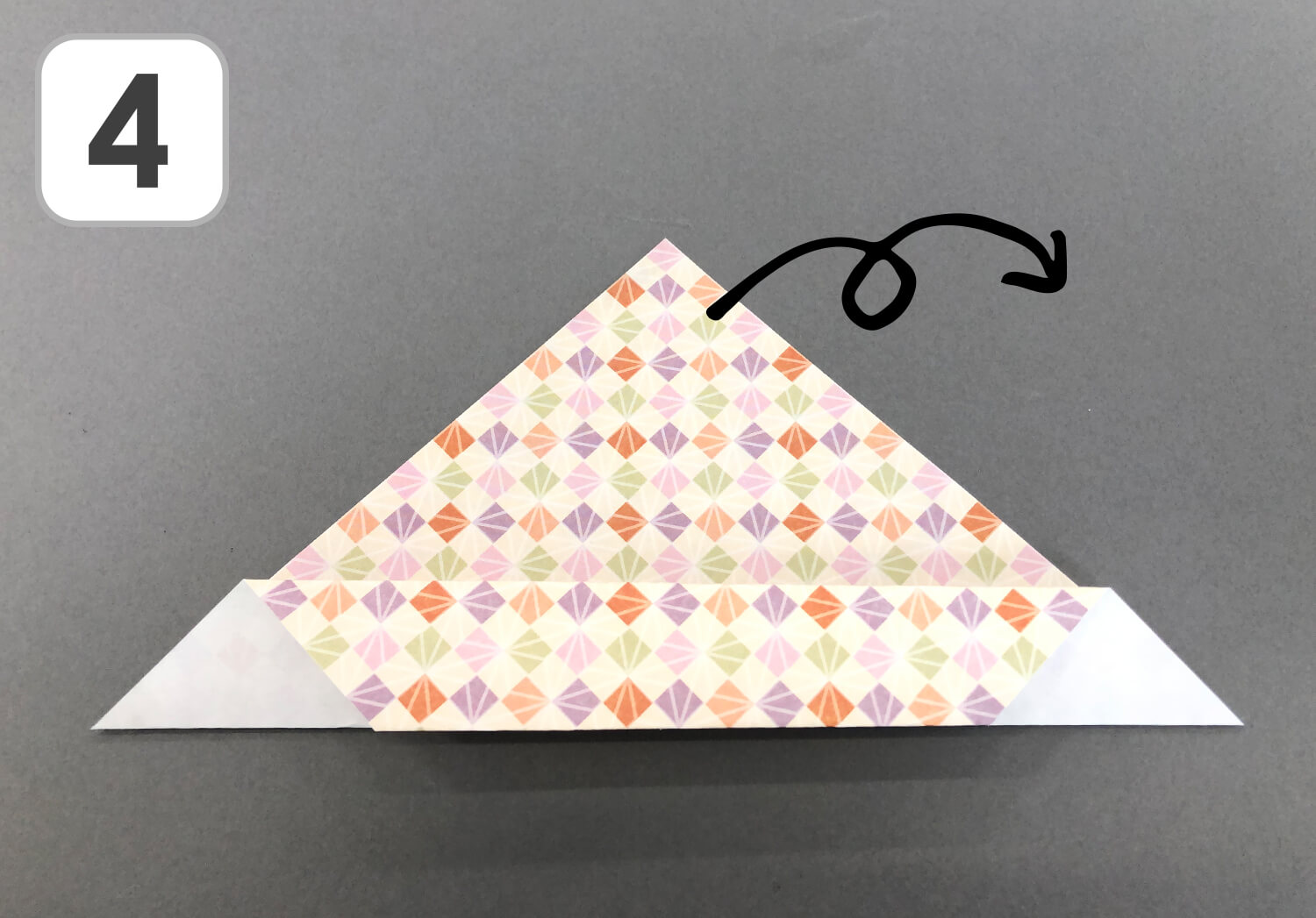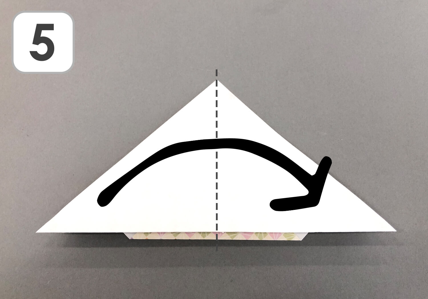 ⑤ ひっくり返したら、点線に沿って三角に折りオリセンを付けたら戻します。