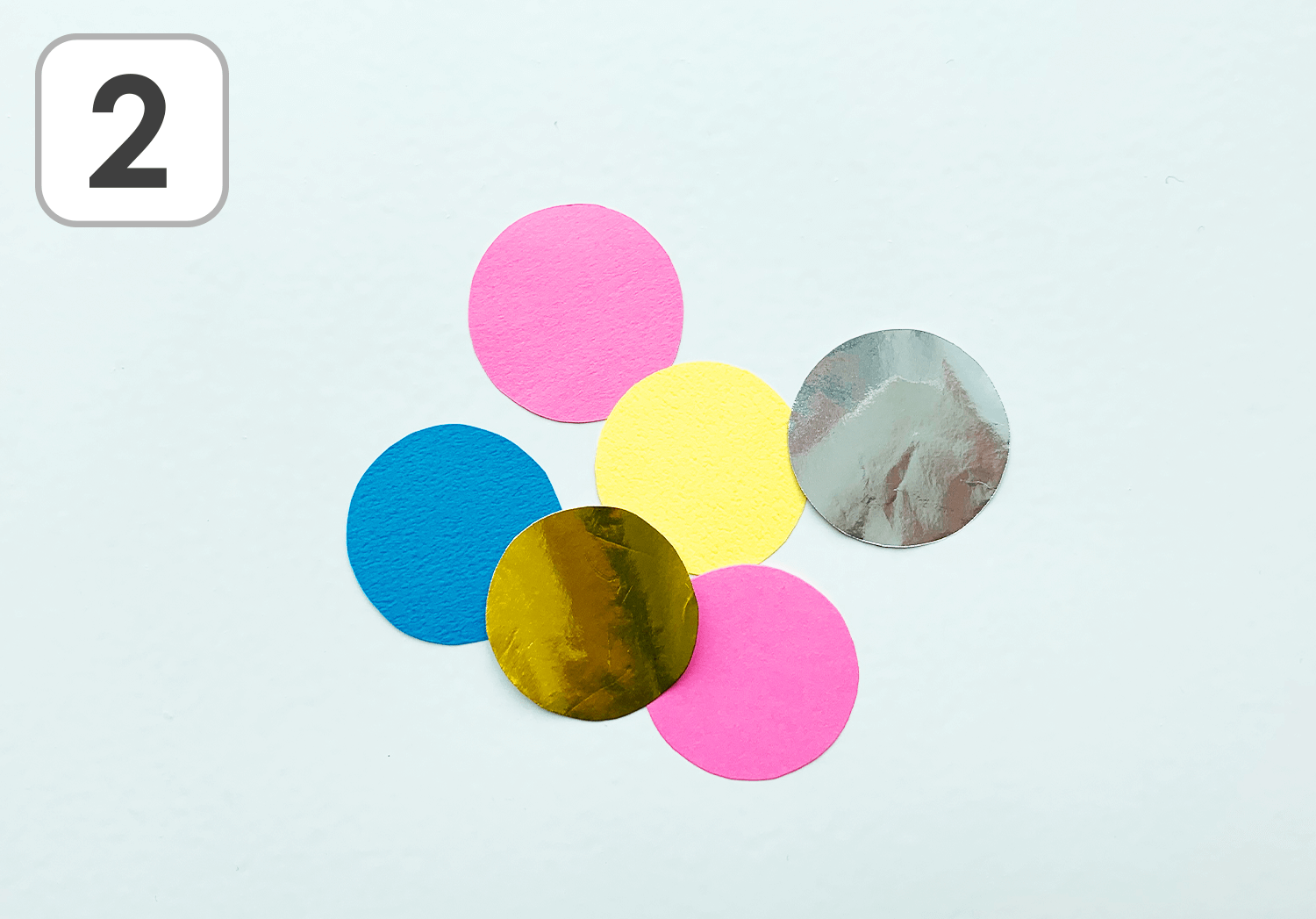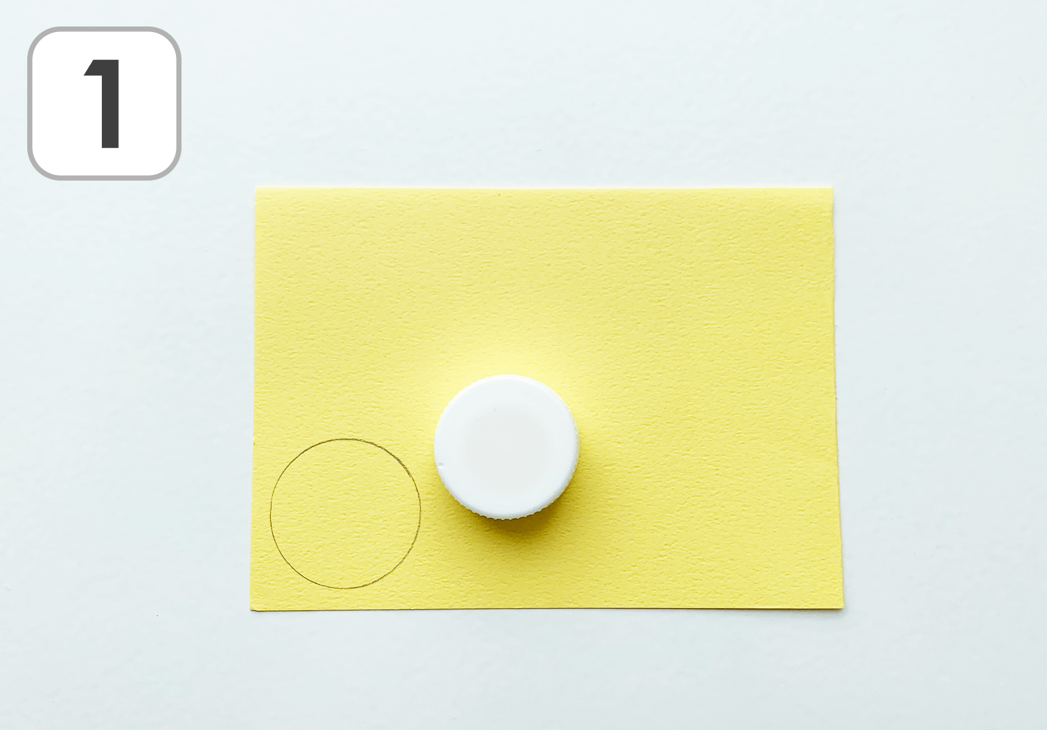 ①ペットボトルの蓋を使って、画用紙とキラキラのおりがみに円を描きます。