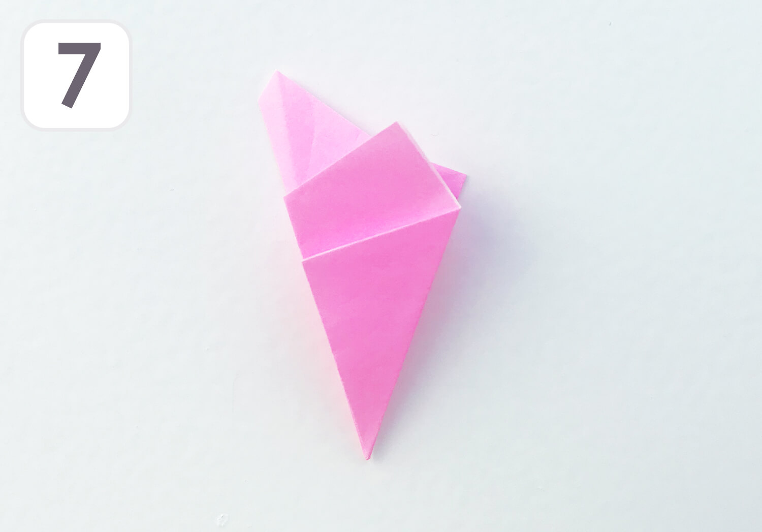 ⑦ さんかくに2回折り、折り目をつけたら開きます。