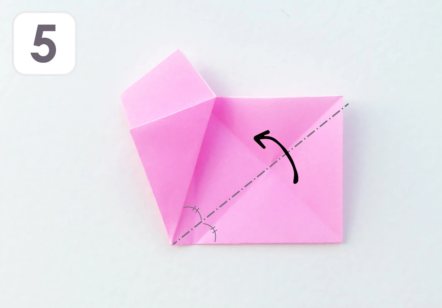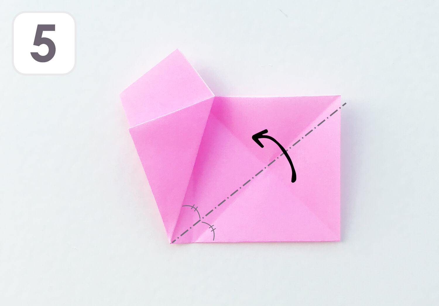 ⑤ 四つ角の先(緑の●)が外に出るように、点線に沿って折ります。