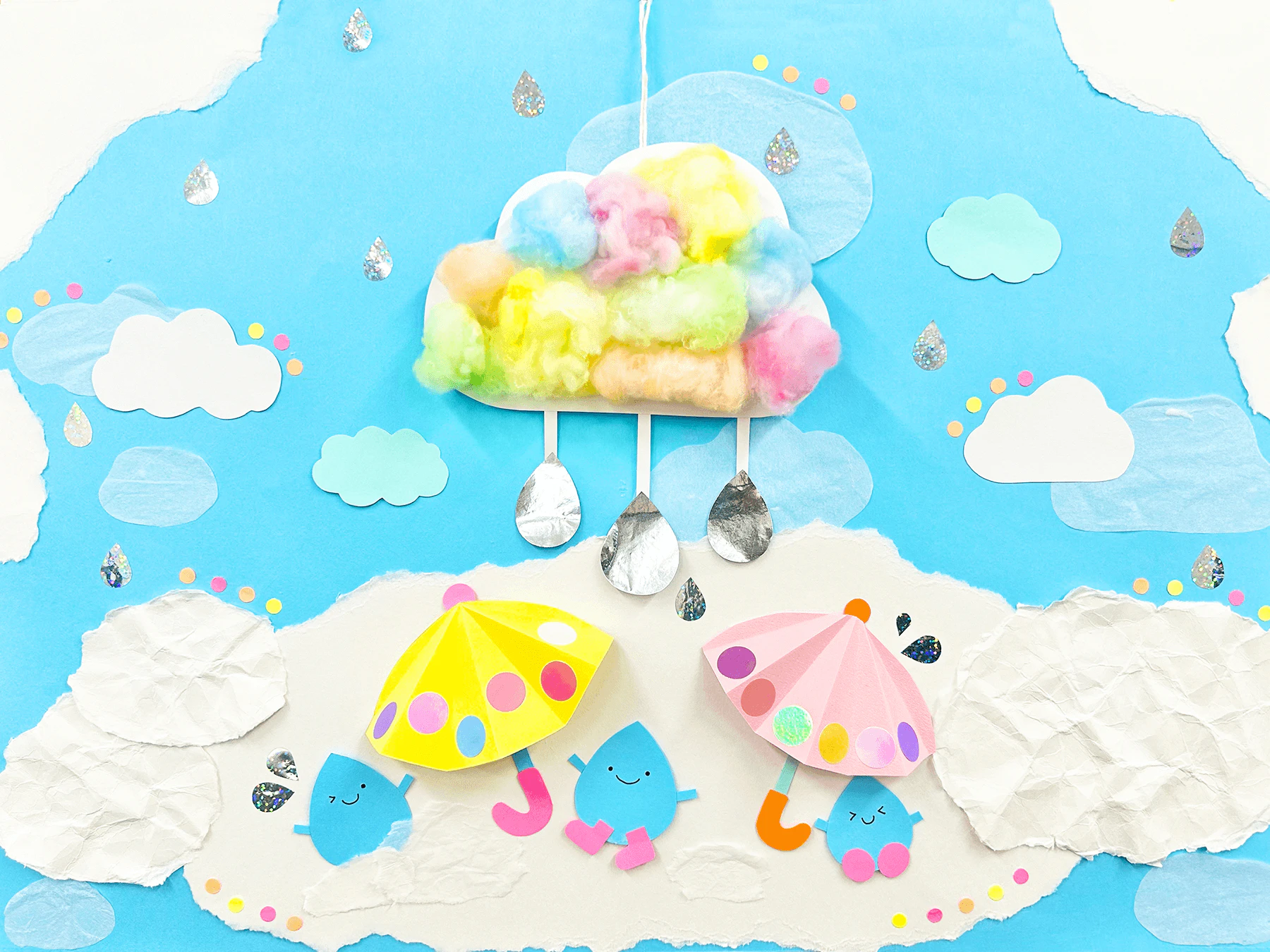 パステルで色付けたふわふわの綿で作る「虹色の雲」やシールの簡単製作「ぺたぺたシールの傘」で、雨の季節の保育室をカラフルに飾りましょう♪